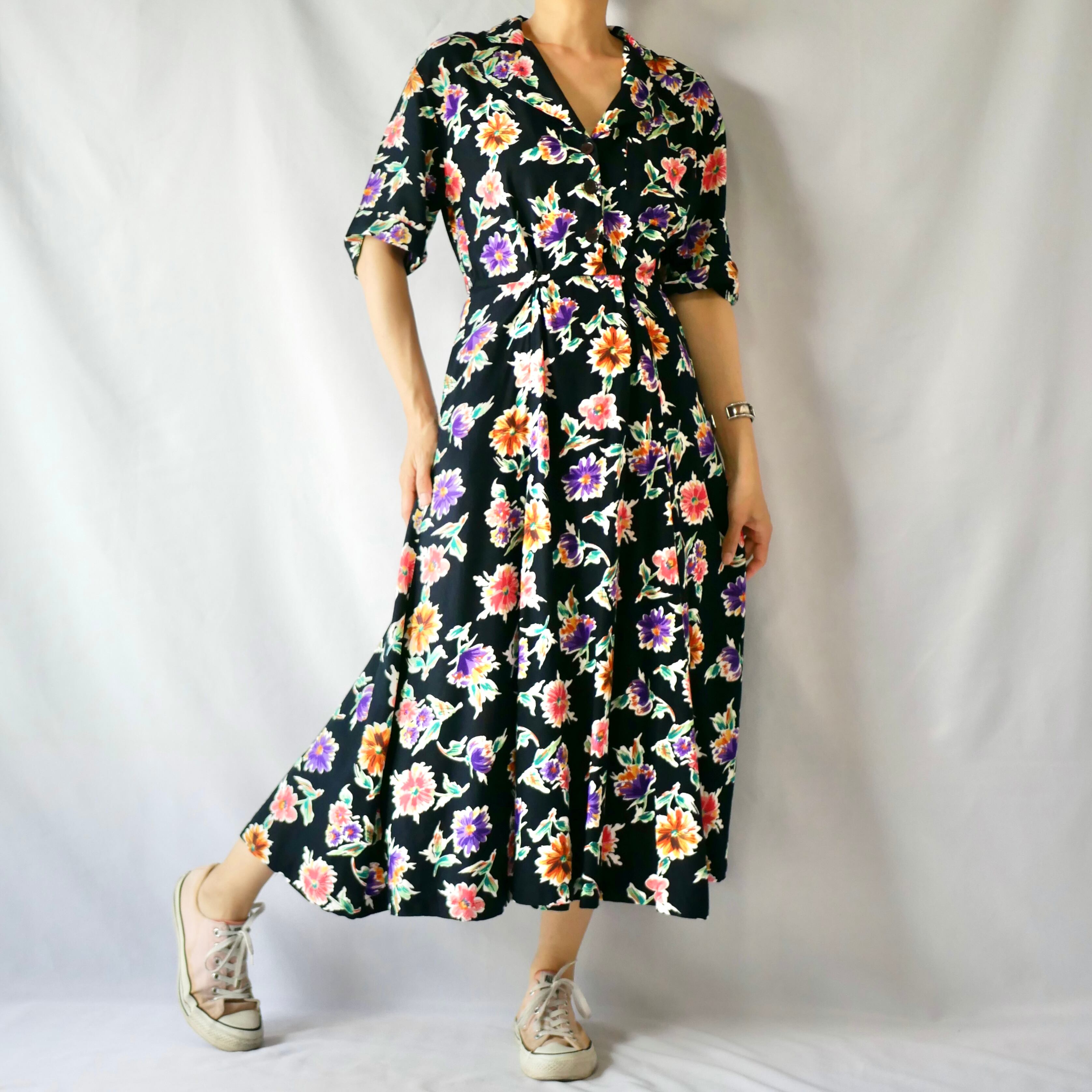 Made in Nepal black colorful floral rayon onepiece オープンカラーカラフル花柄ワンピース
