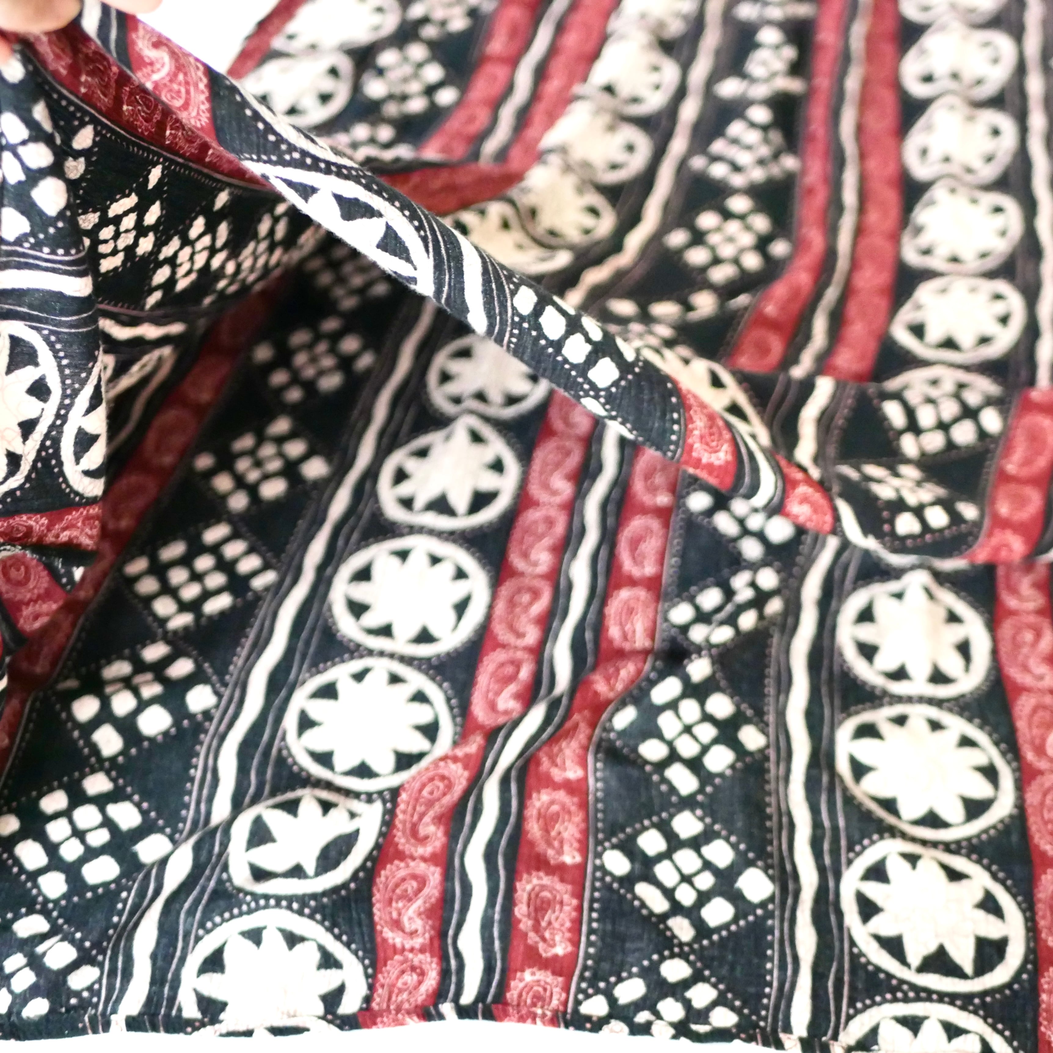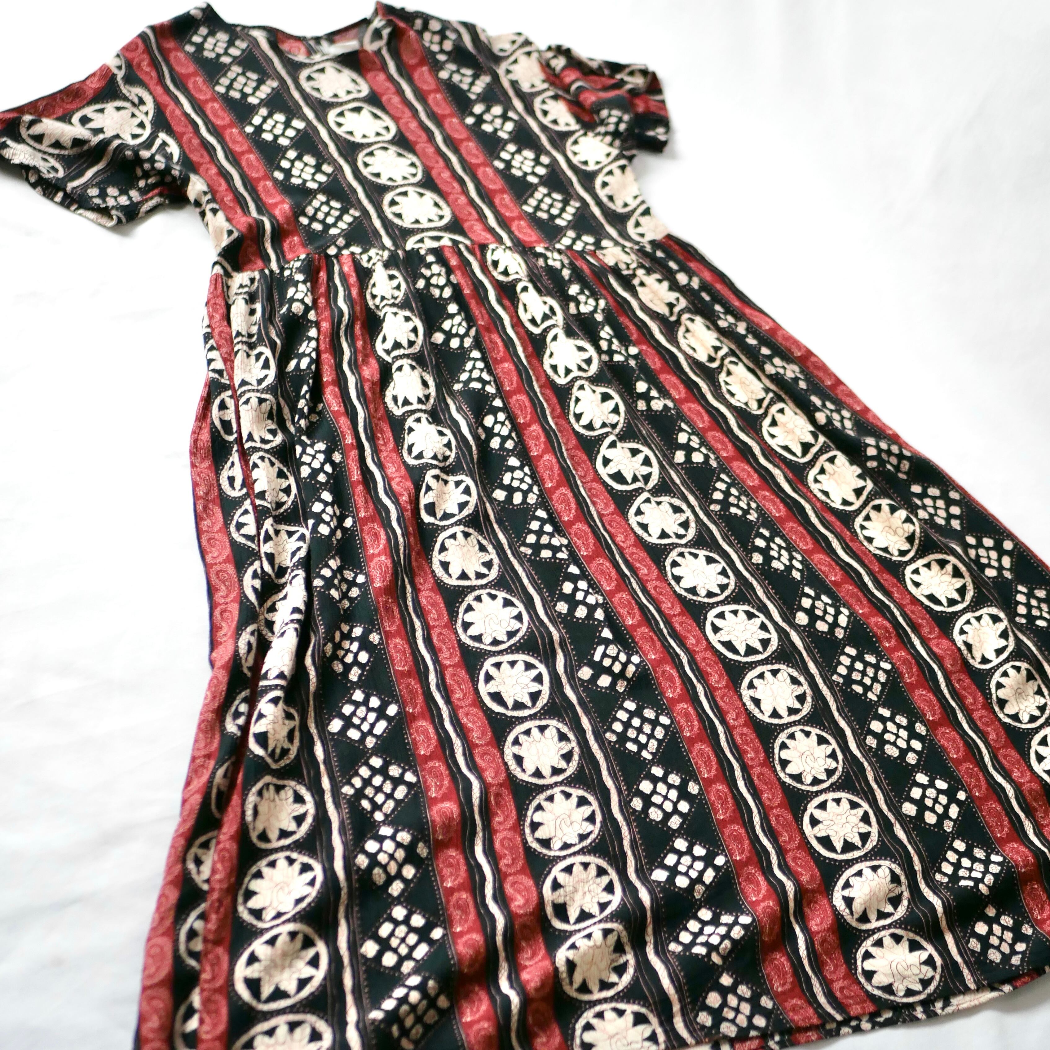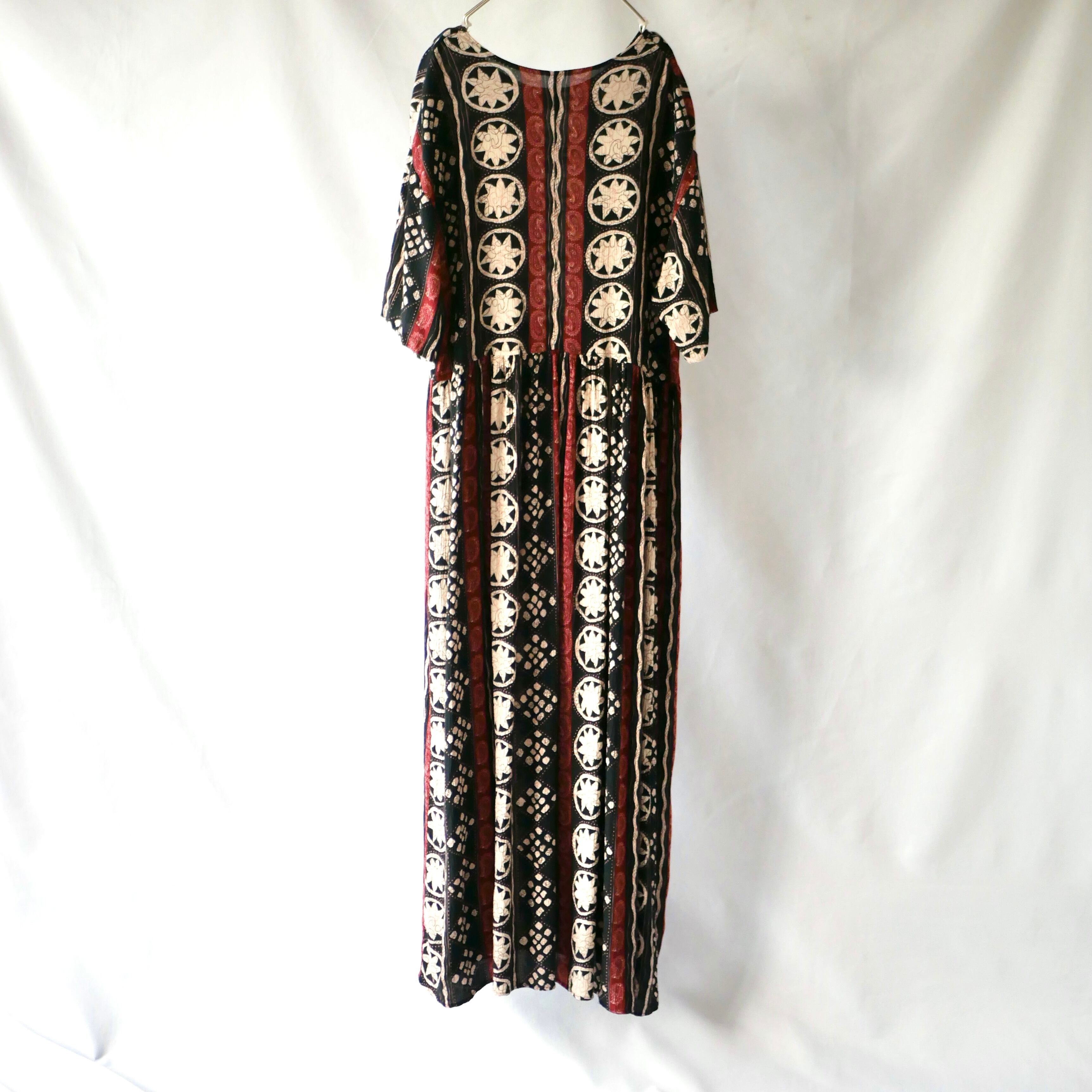 不思議なエスニック風総柄のブラウン、ブラックレーヨン素材アメリカ製マキシワンピースです。