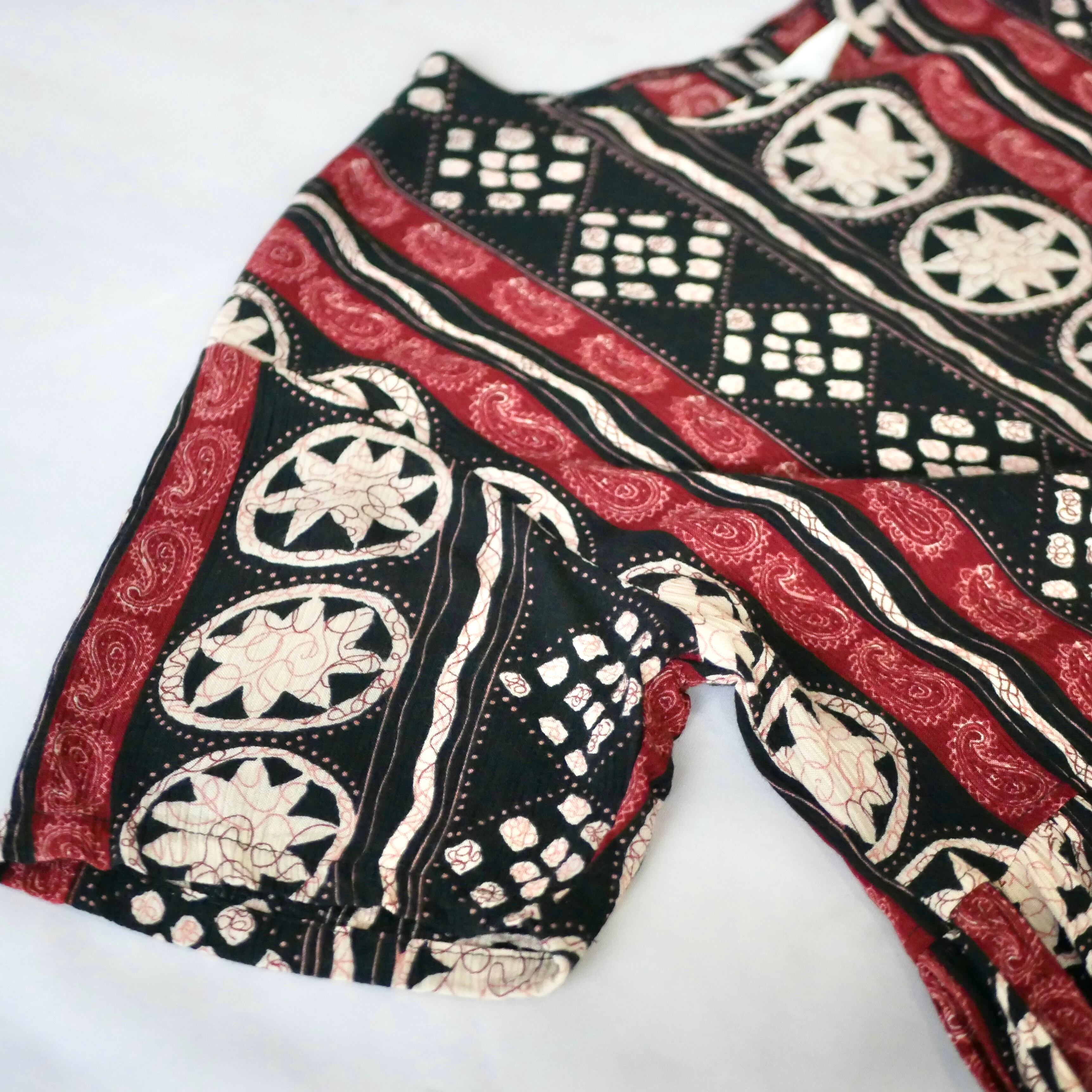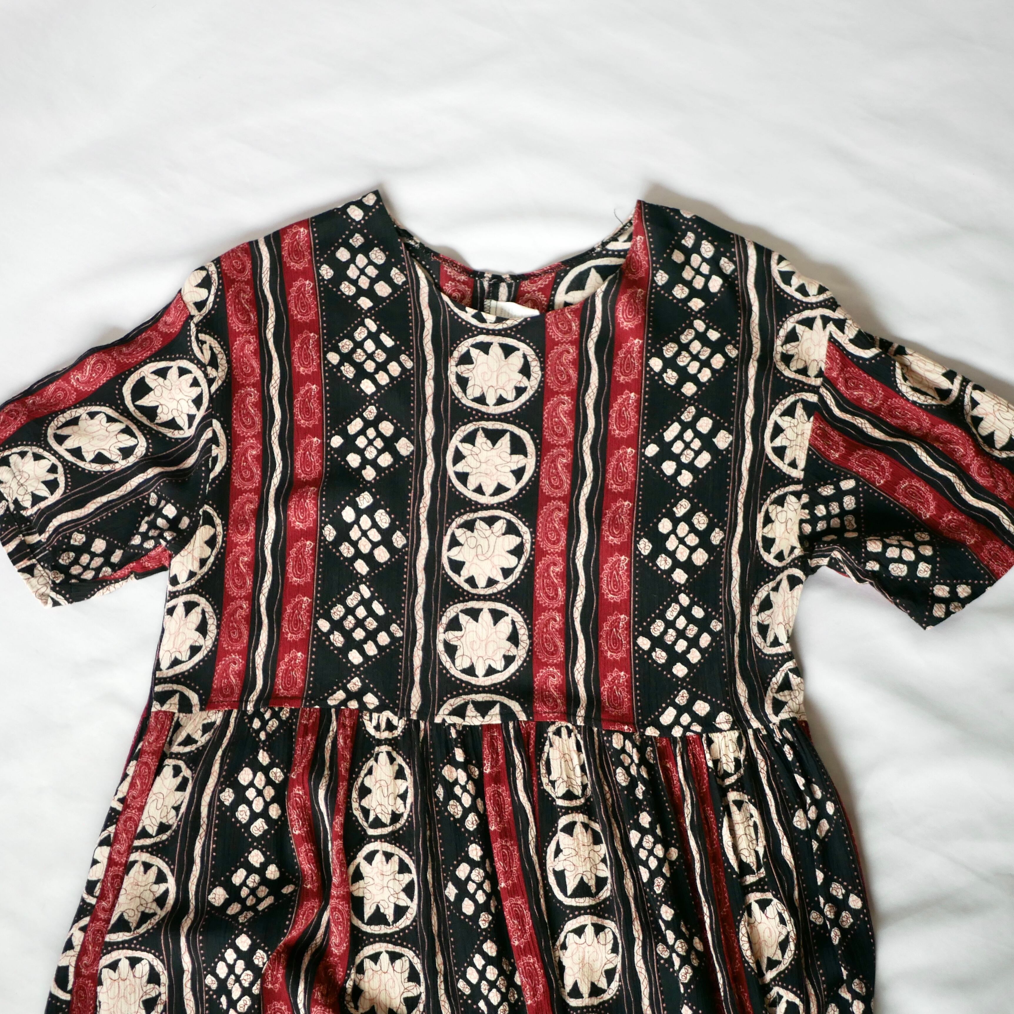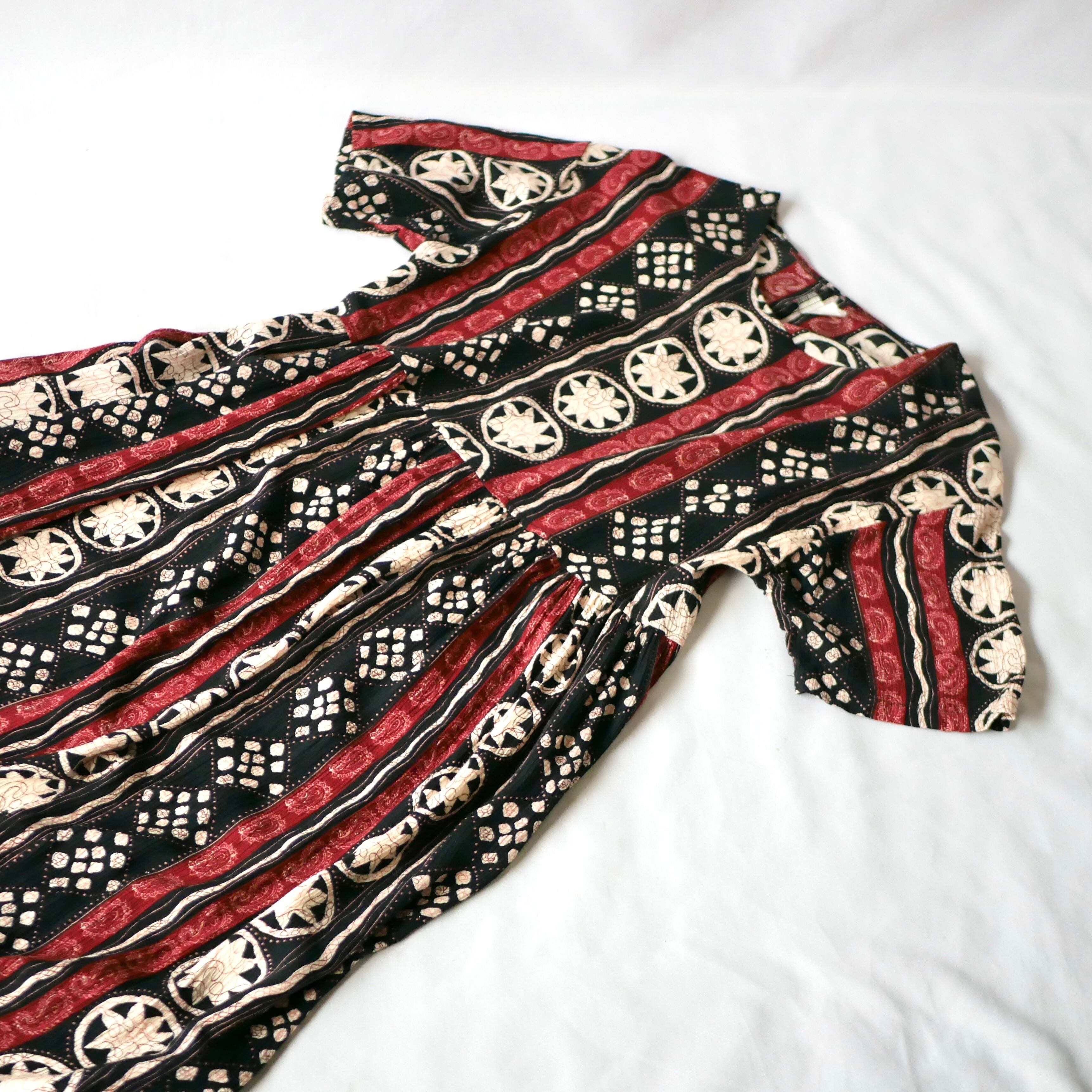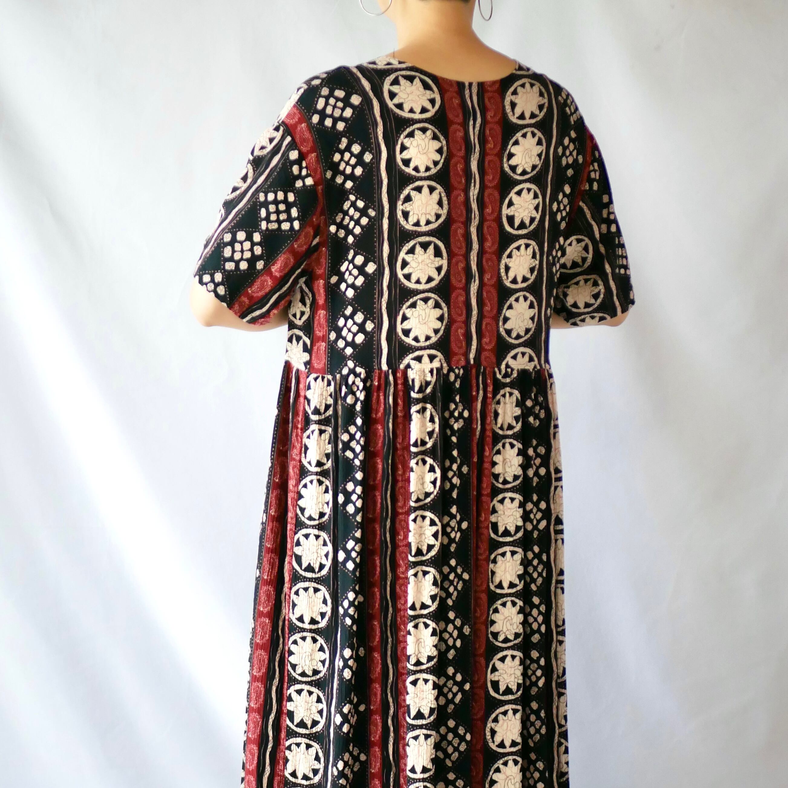 Made in USA rayon ethnic maxi onepiece アメリカ製 ブラウン ブラック 総柄 ギャザー レーヨンマキシワンピース | &Dorothy used&vintage 古着屋
