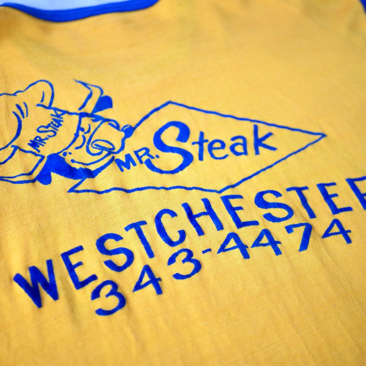 ステーキハウスの宣伝用のTシャツの様でコックに扮した牛のバックプリントがキャッチーで可愛いです。