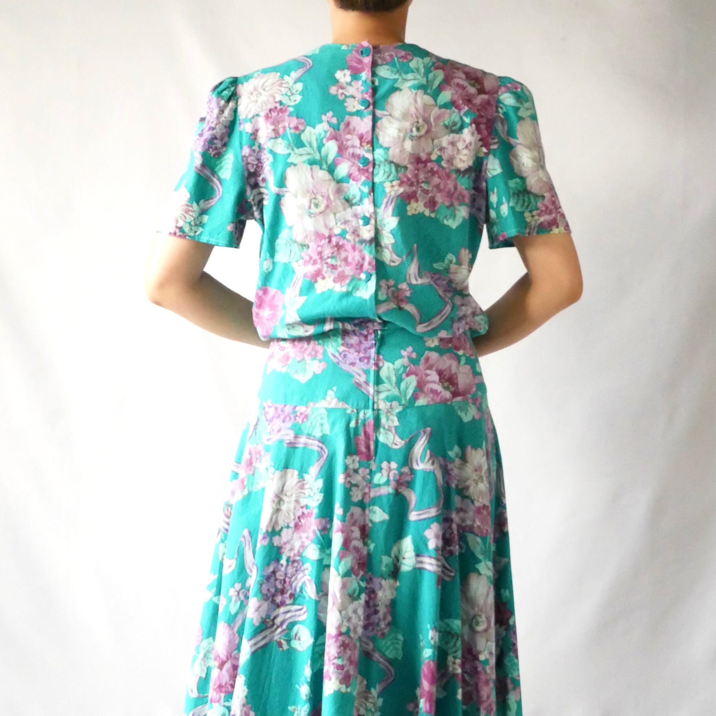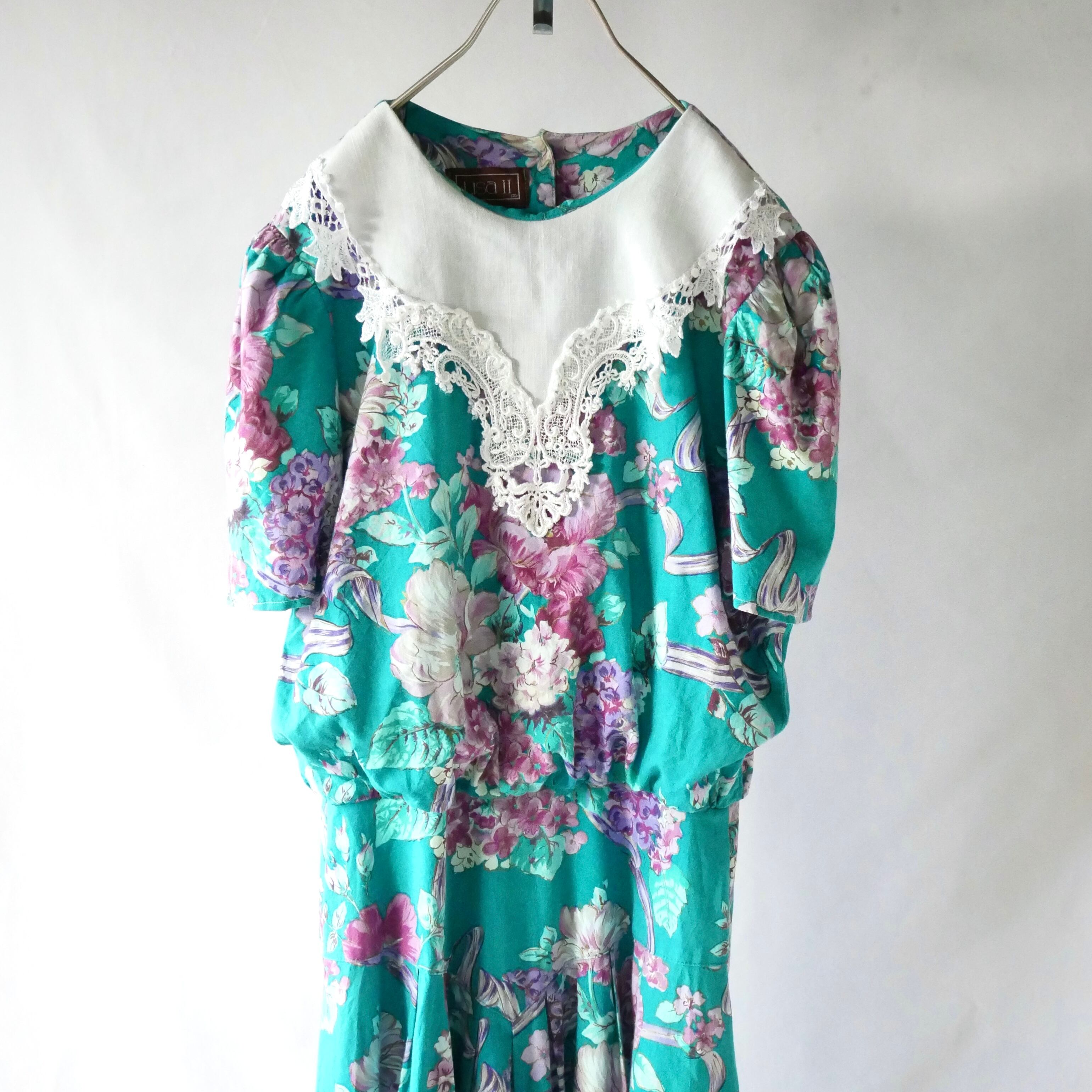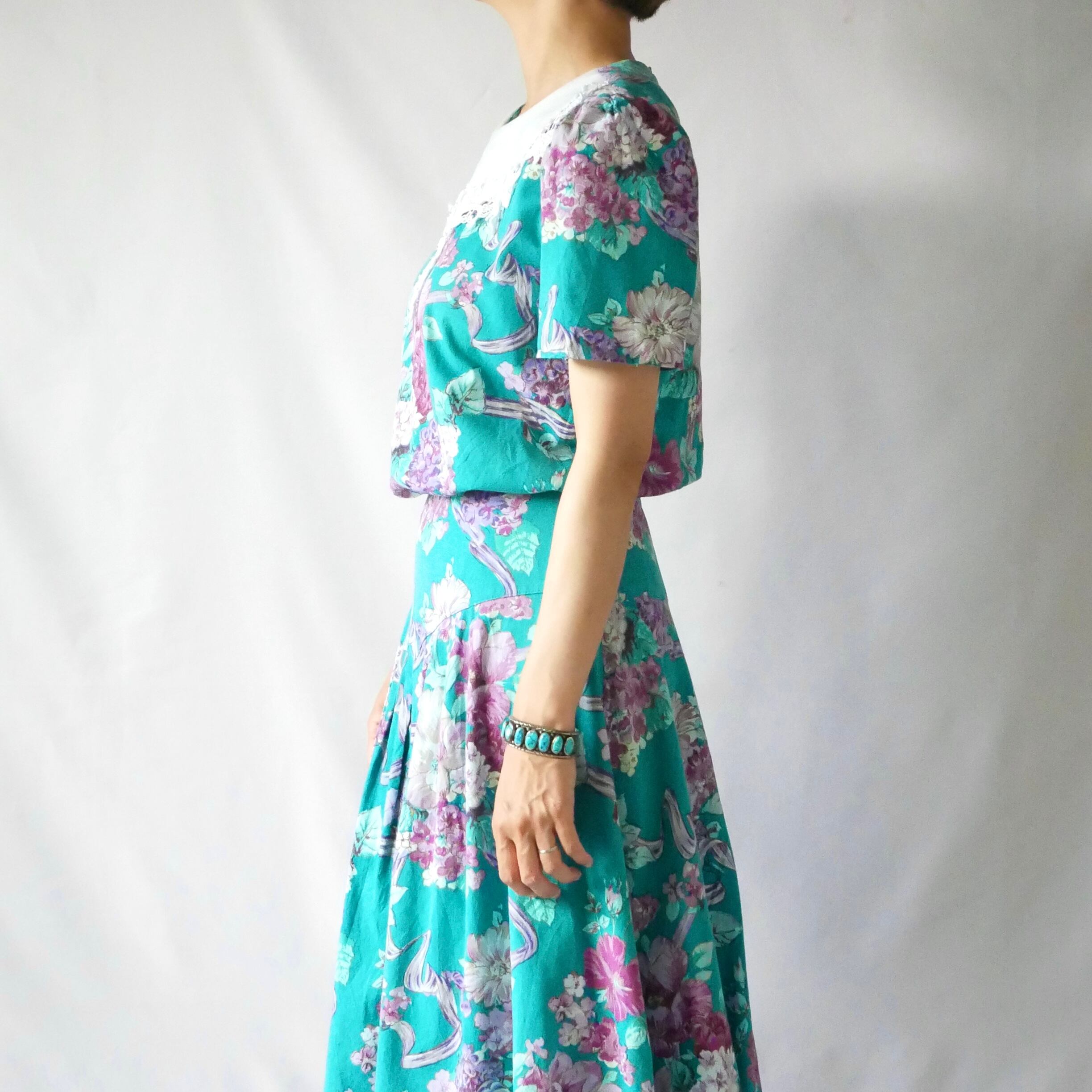 Made in USA green floral long onepiece アメリカ製 グリーン花柄 白レース襟 マキシワンピース