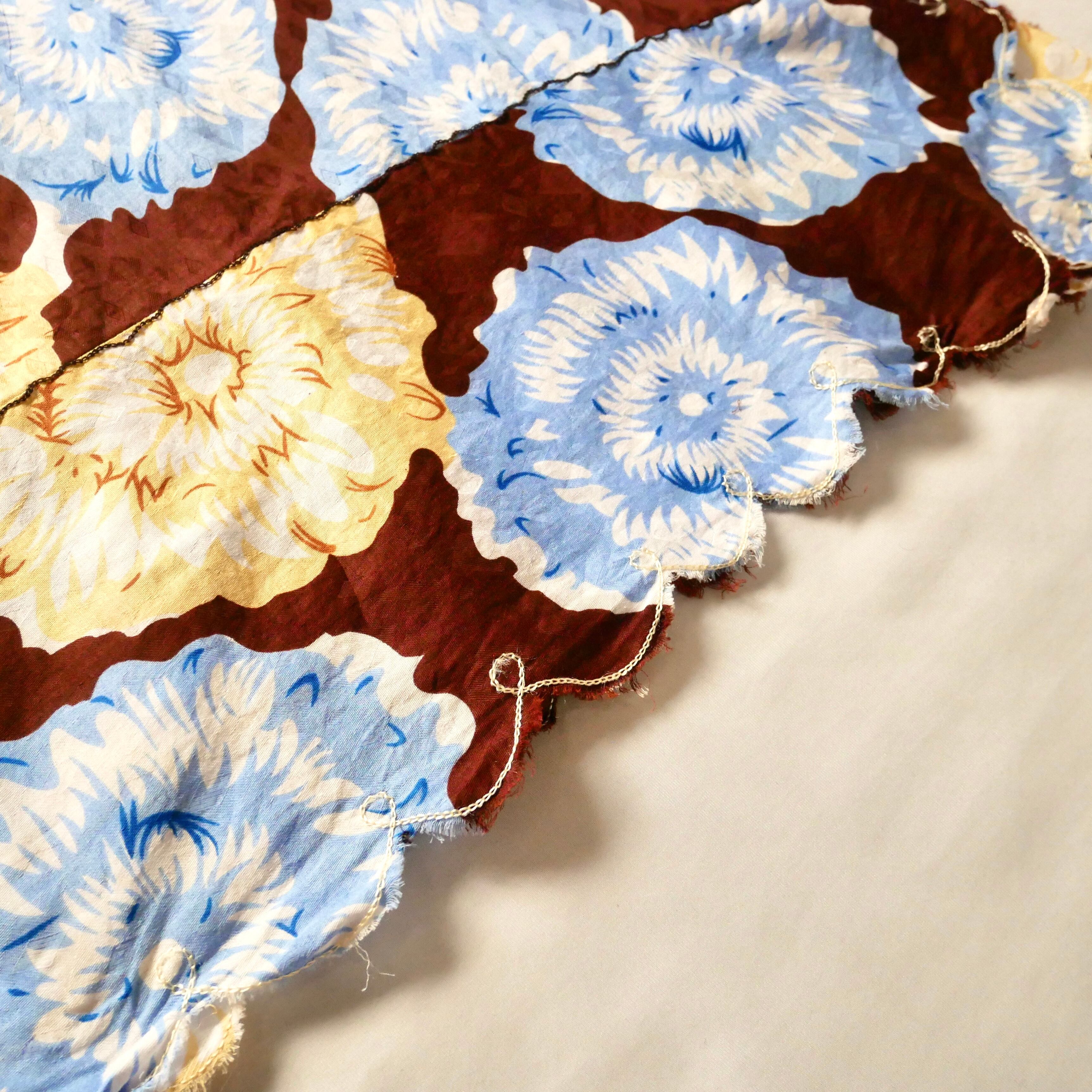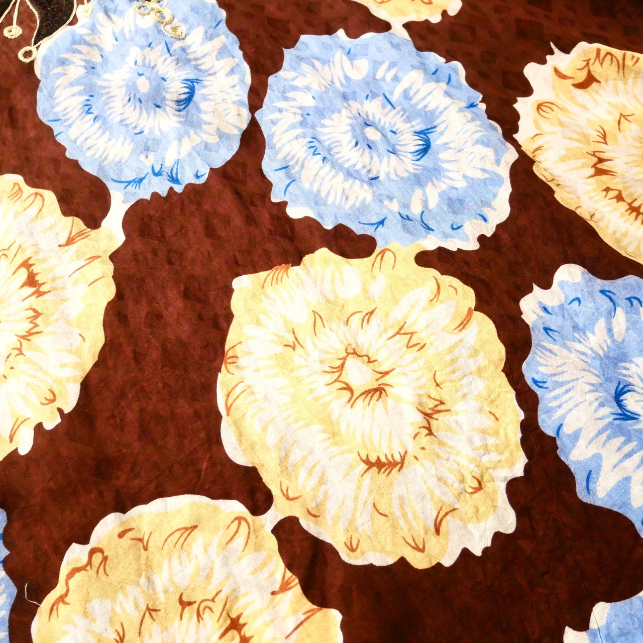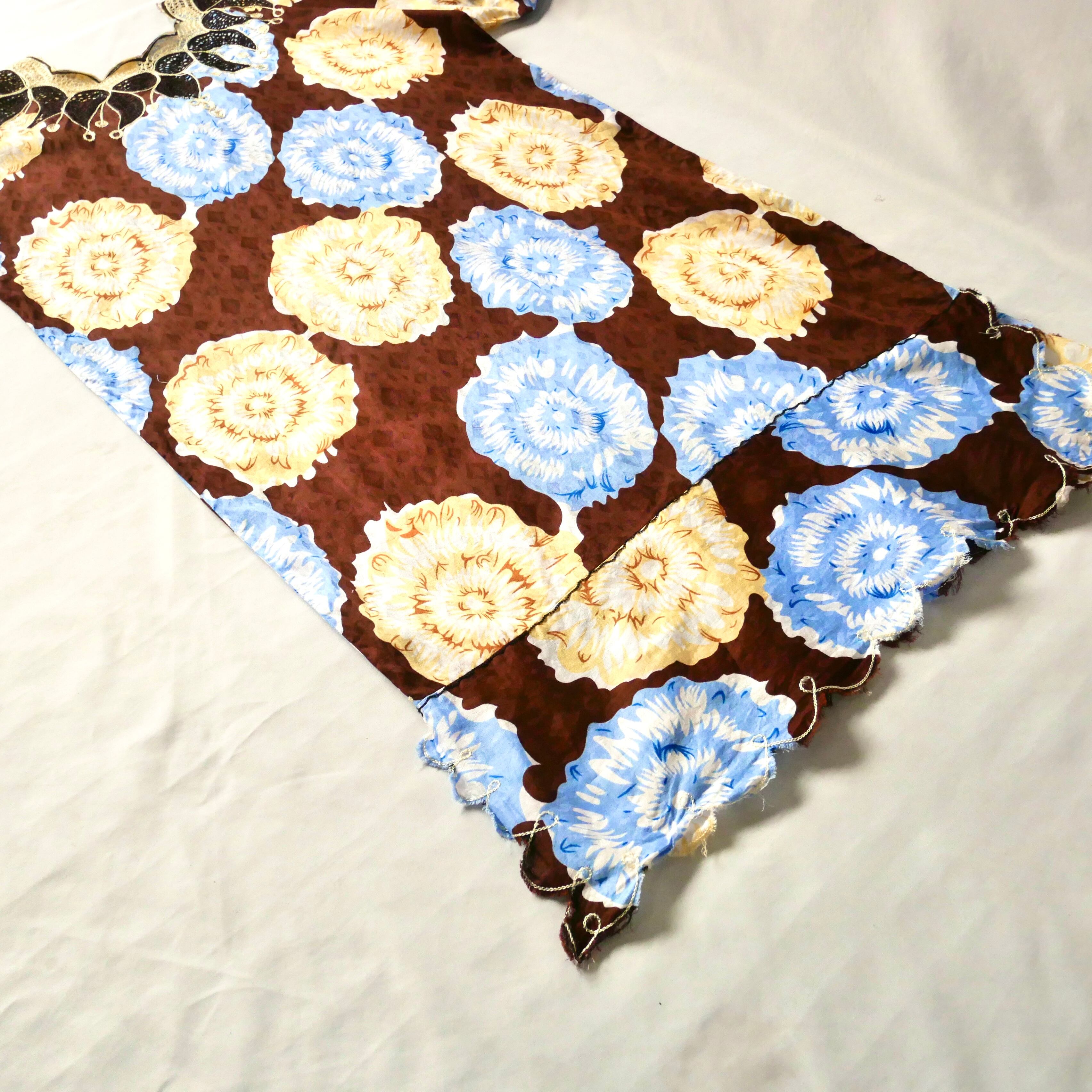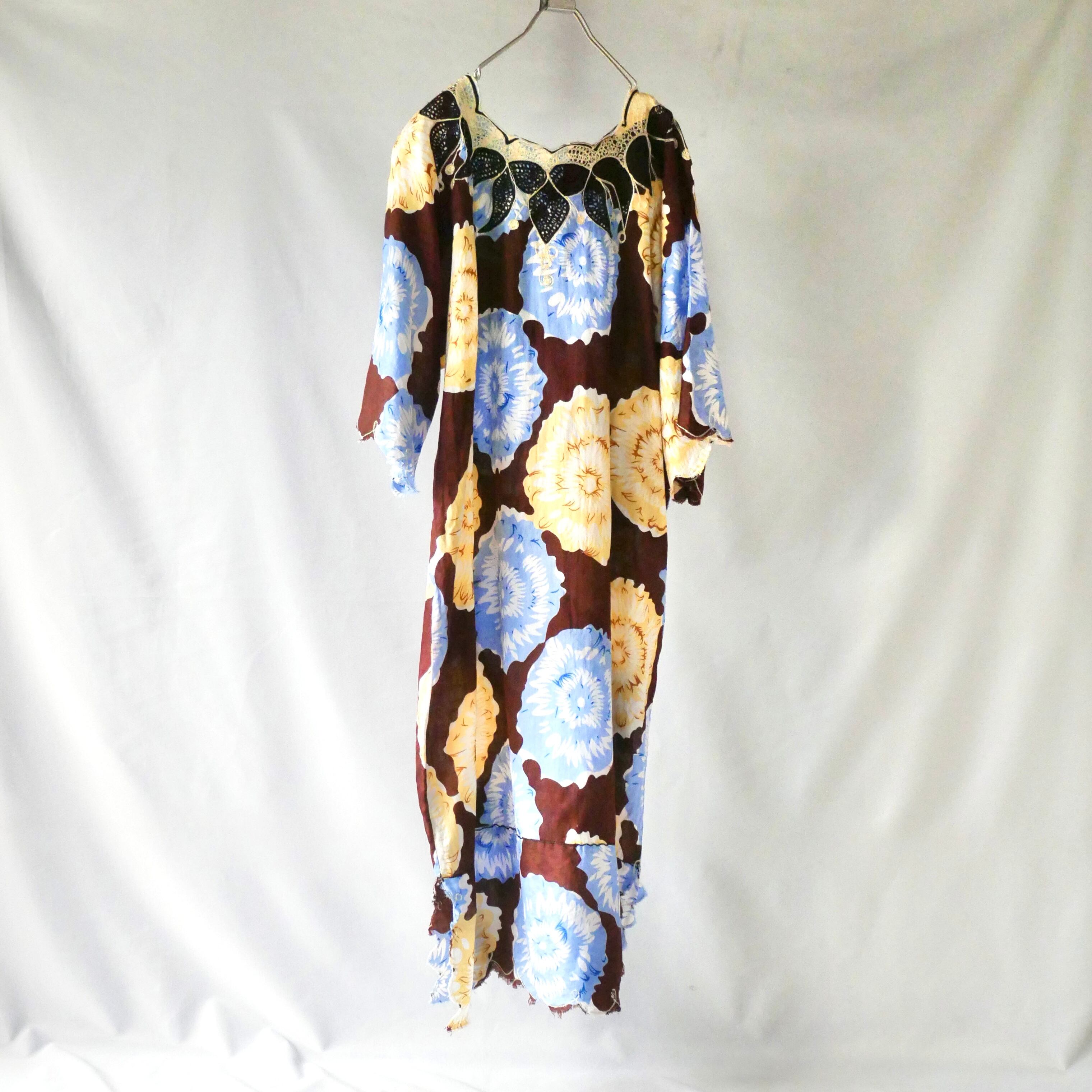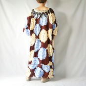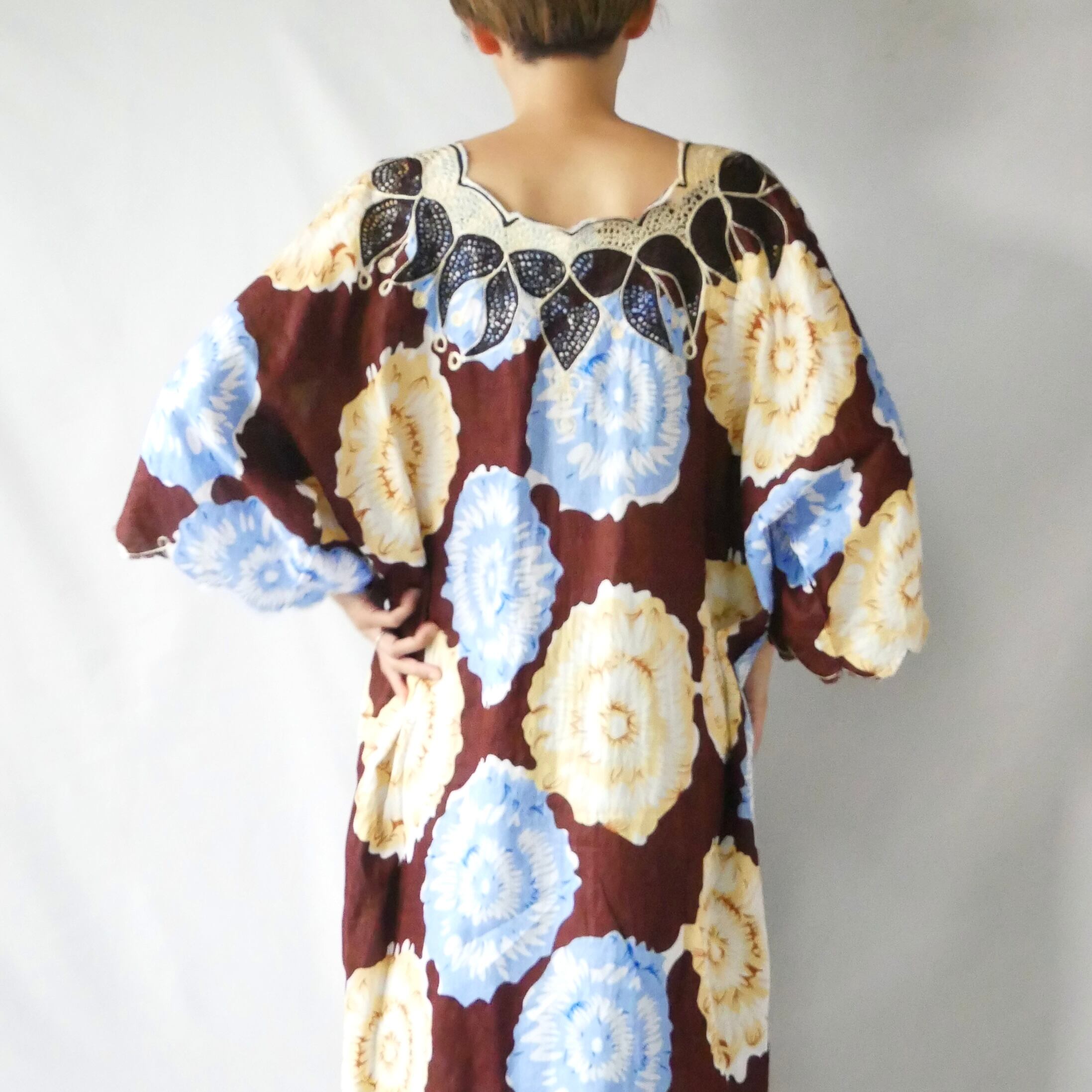 落ち着いたブラウンカラーにブルーとイエローの大胆な花柄が可愛いバティックワンピースです。