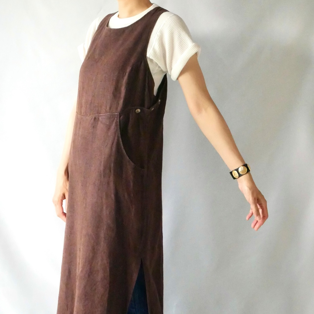 ざっくりと粗めの手触りのリネンが気持ち良いジャンパースカート型ワンピースです。