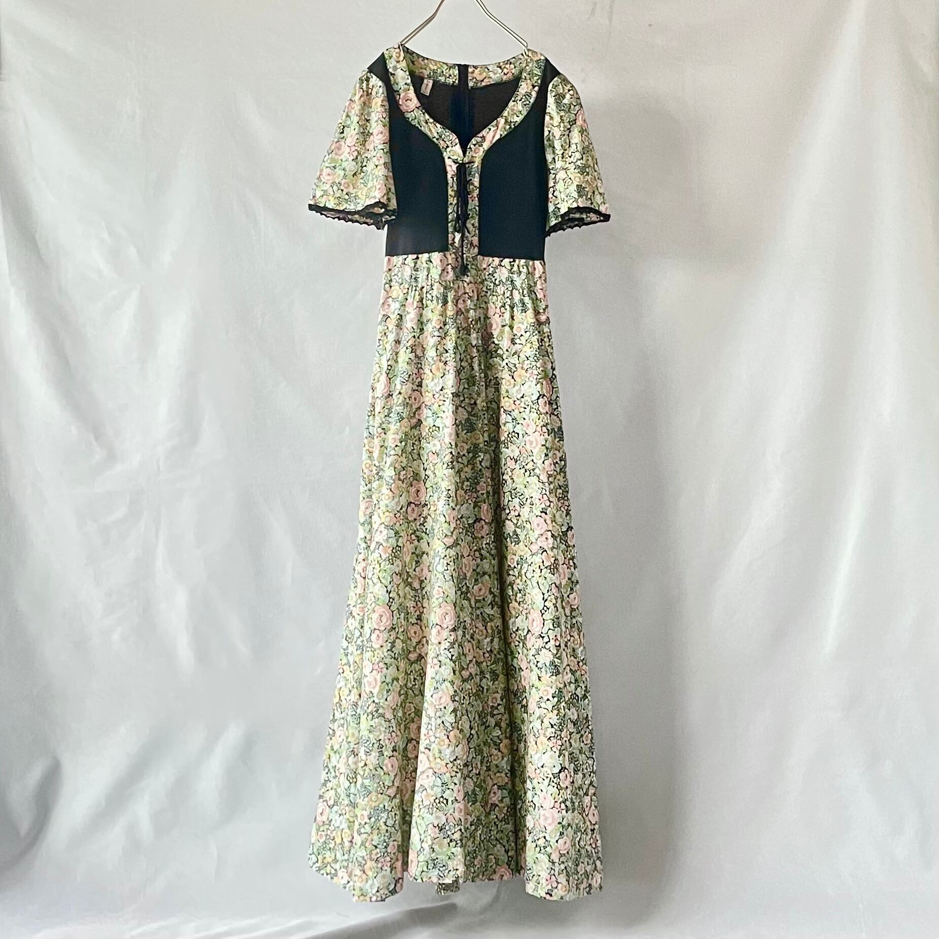 Euro vintage 70s floral maxi onepiece ユーロ ヴィンテージ 70年代 胸元編み上げ 小花柄 黒 マキシワンピース