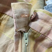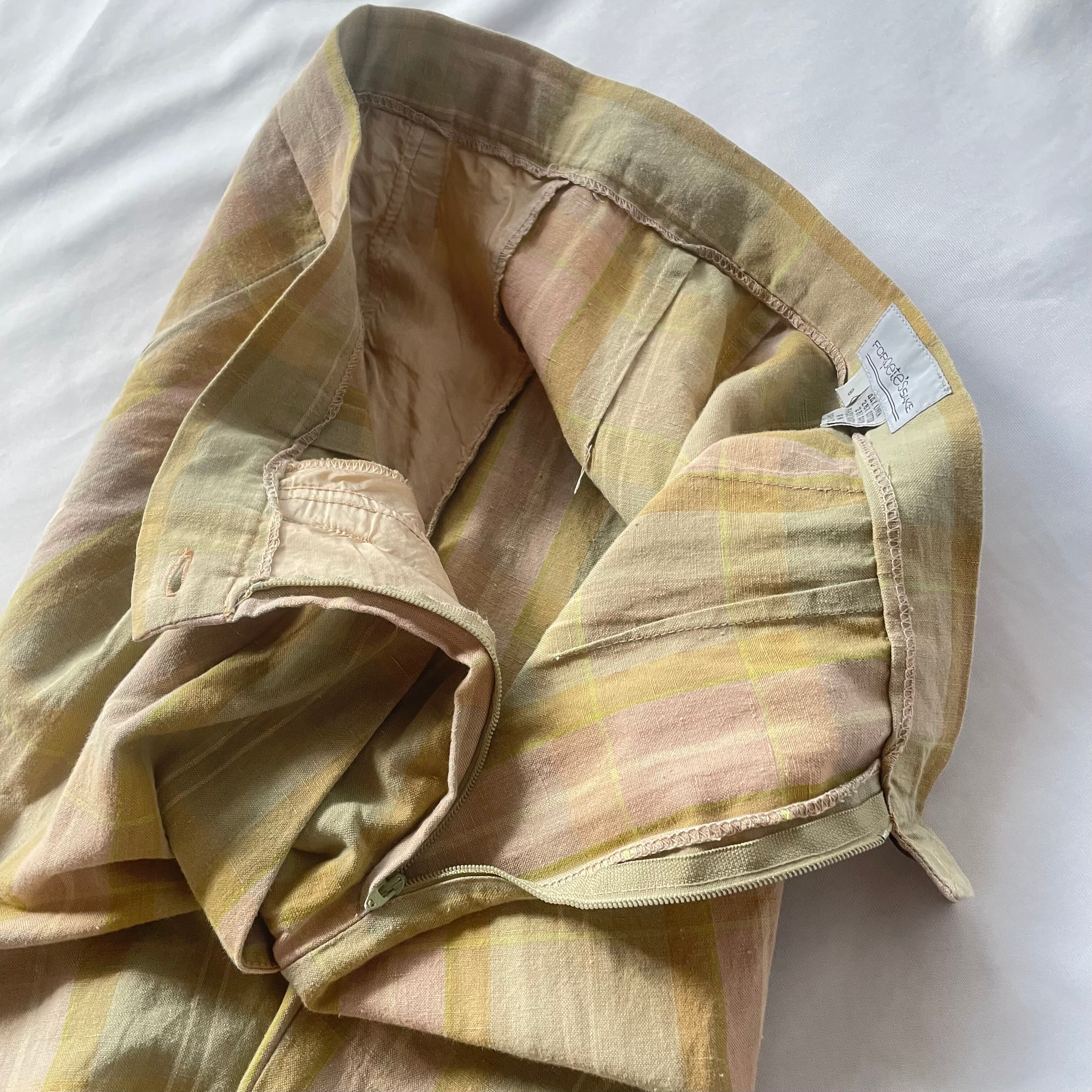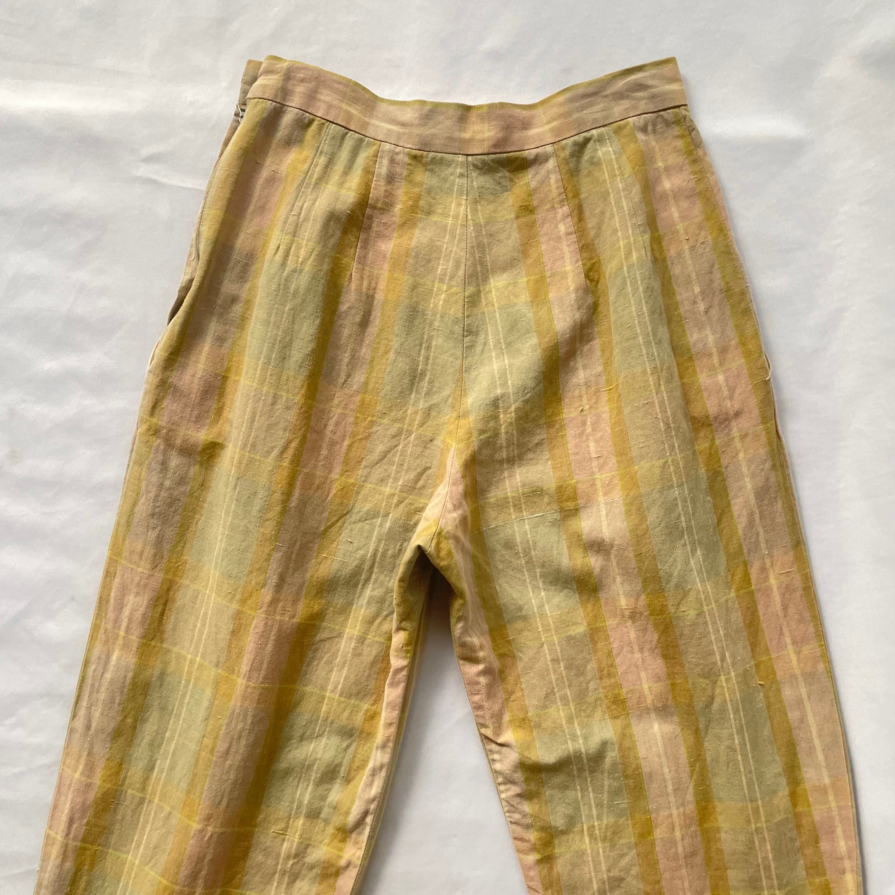 ピンクとイエローベージュの優しい色味のチェックが可愛いタック入りリネン混パンツです。