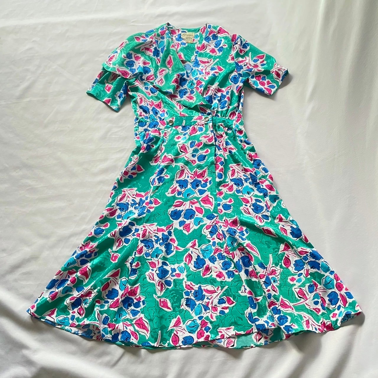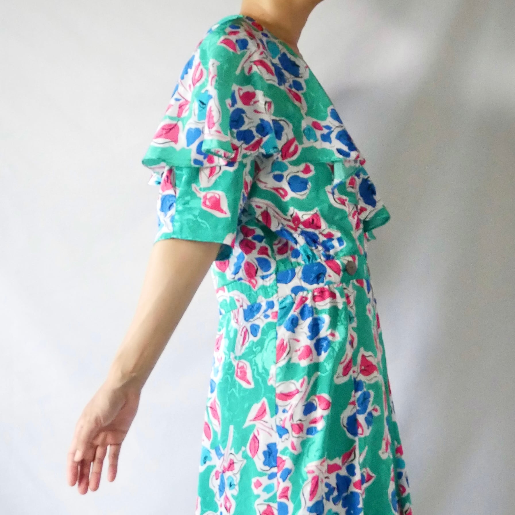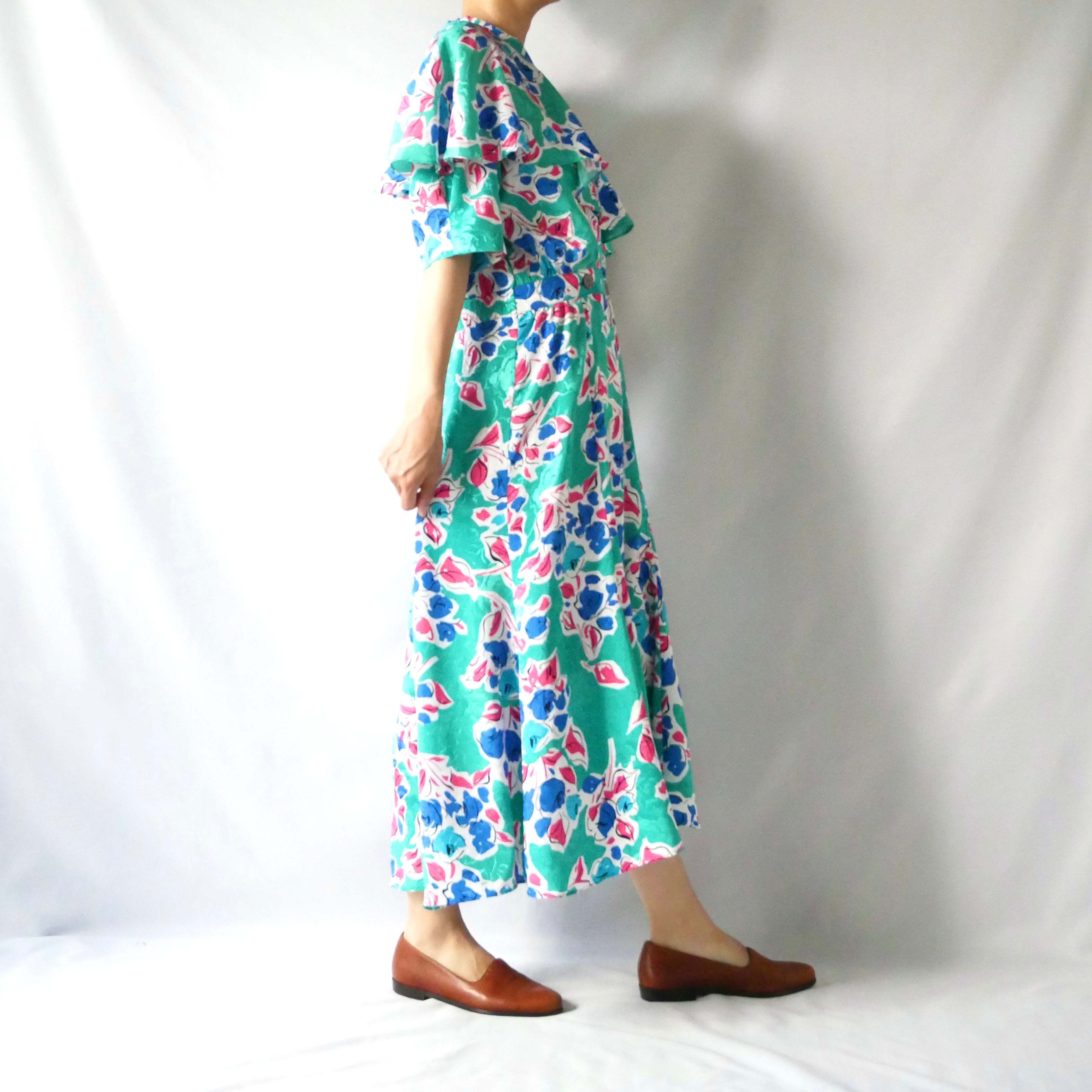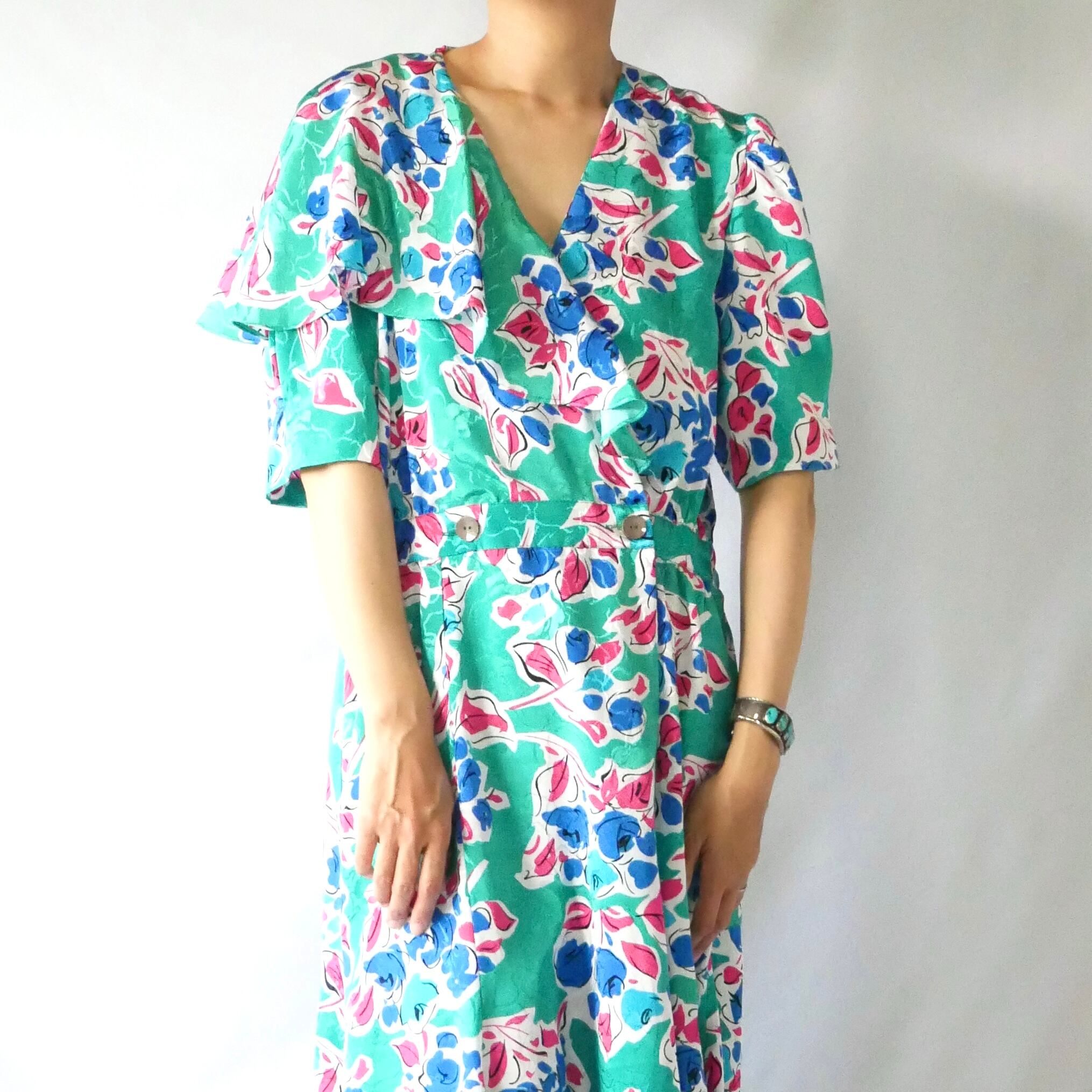 80年代頃のグリーンにピンク、ブルーの花柄が可愛いポリエステルワンピースです。