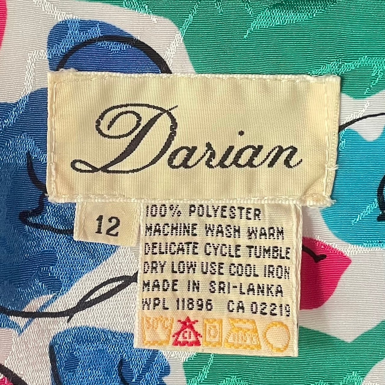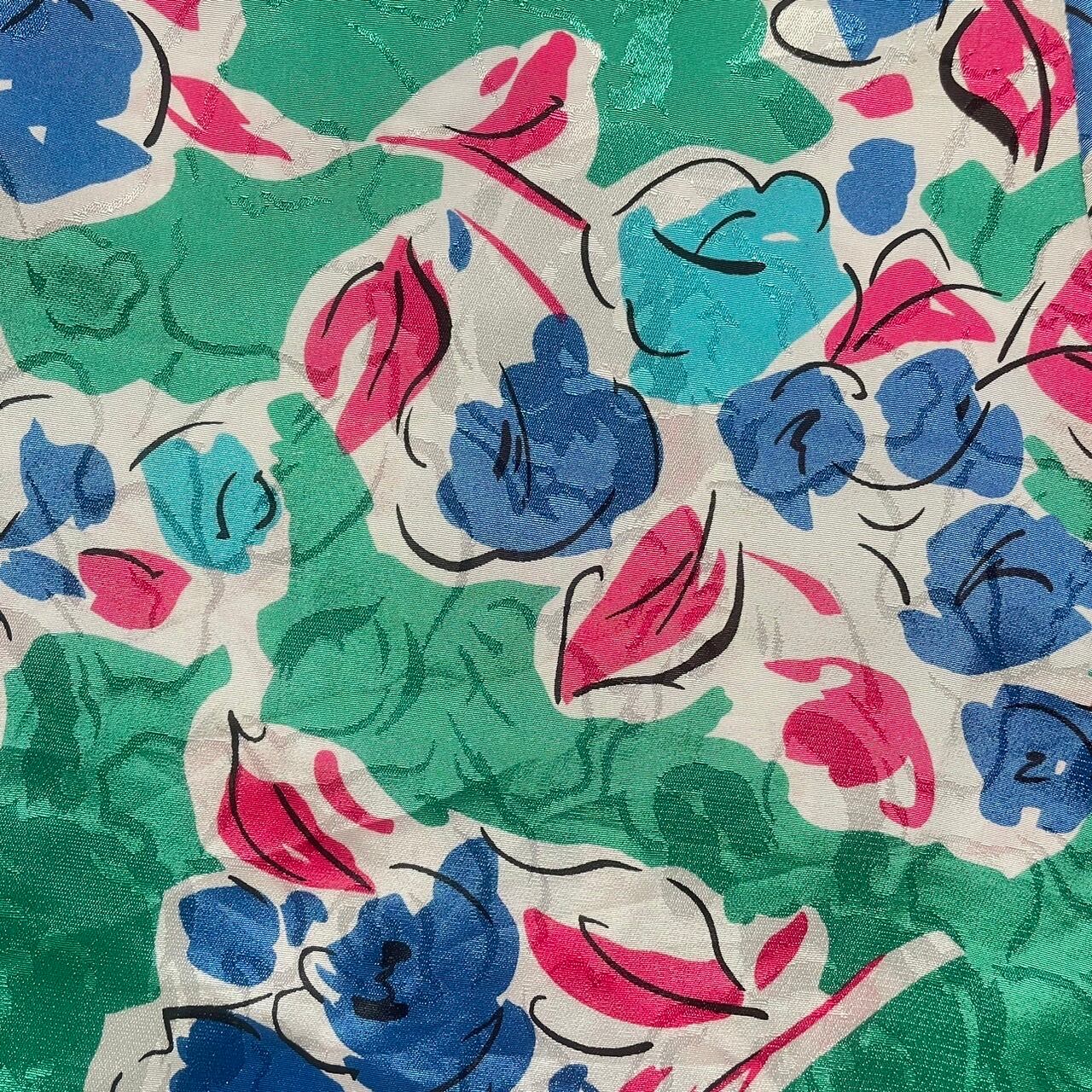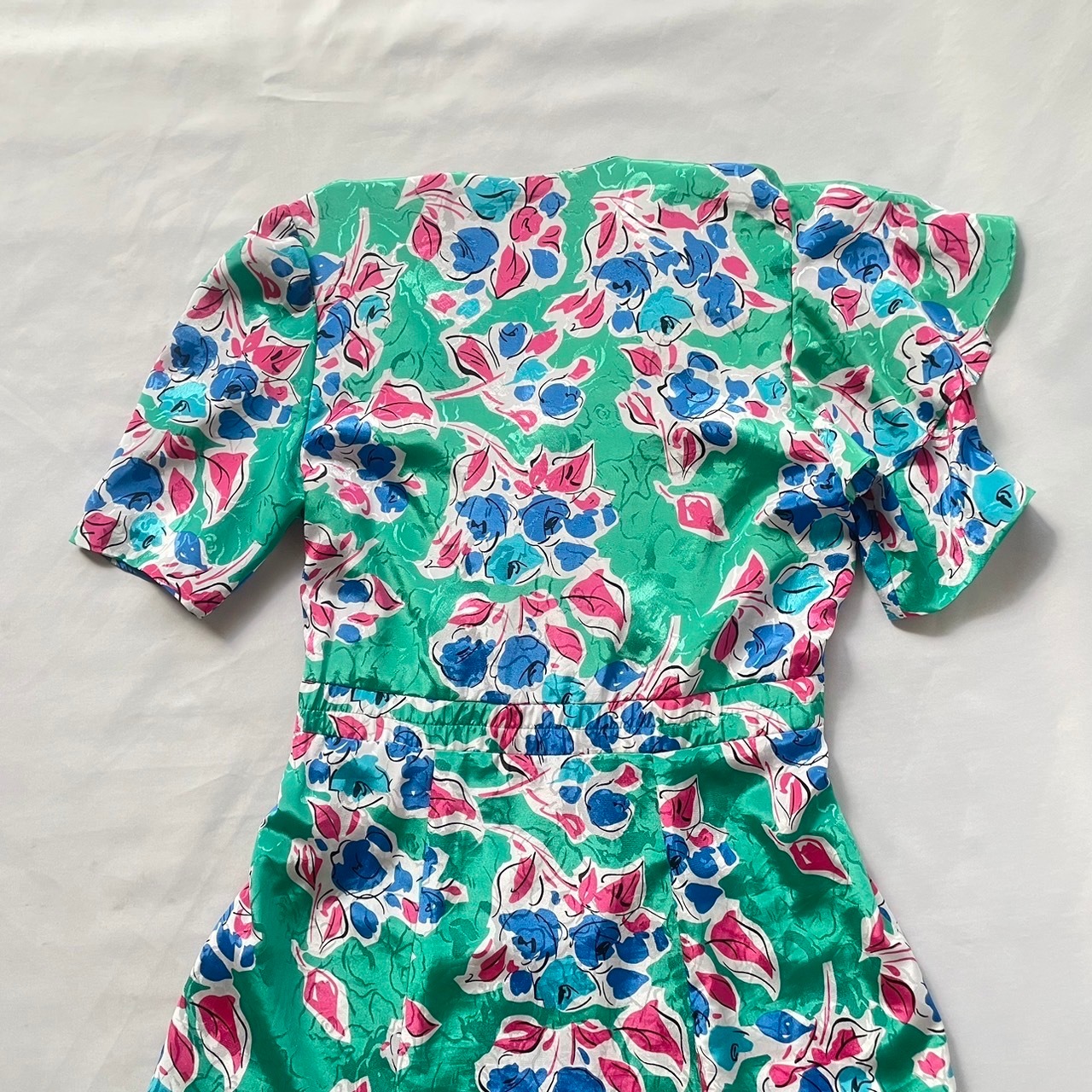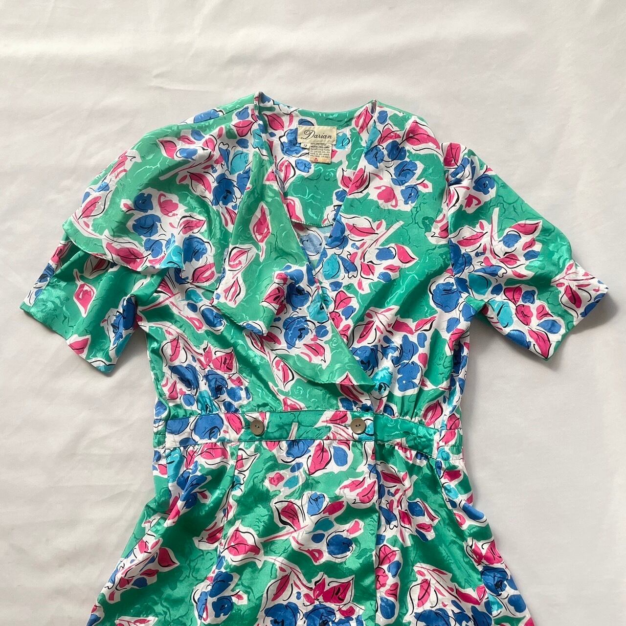 80年代頃のグリーンにピンク、ブルーの花柄が可愛いポリエステルワンピースです。
