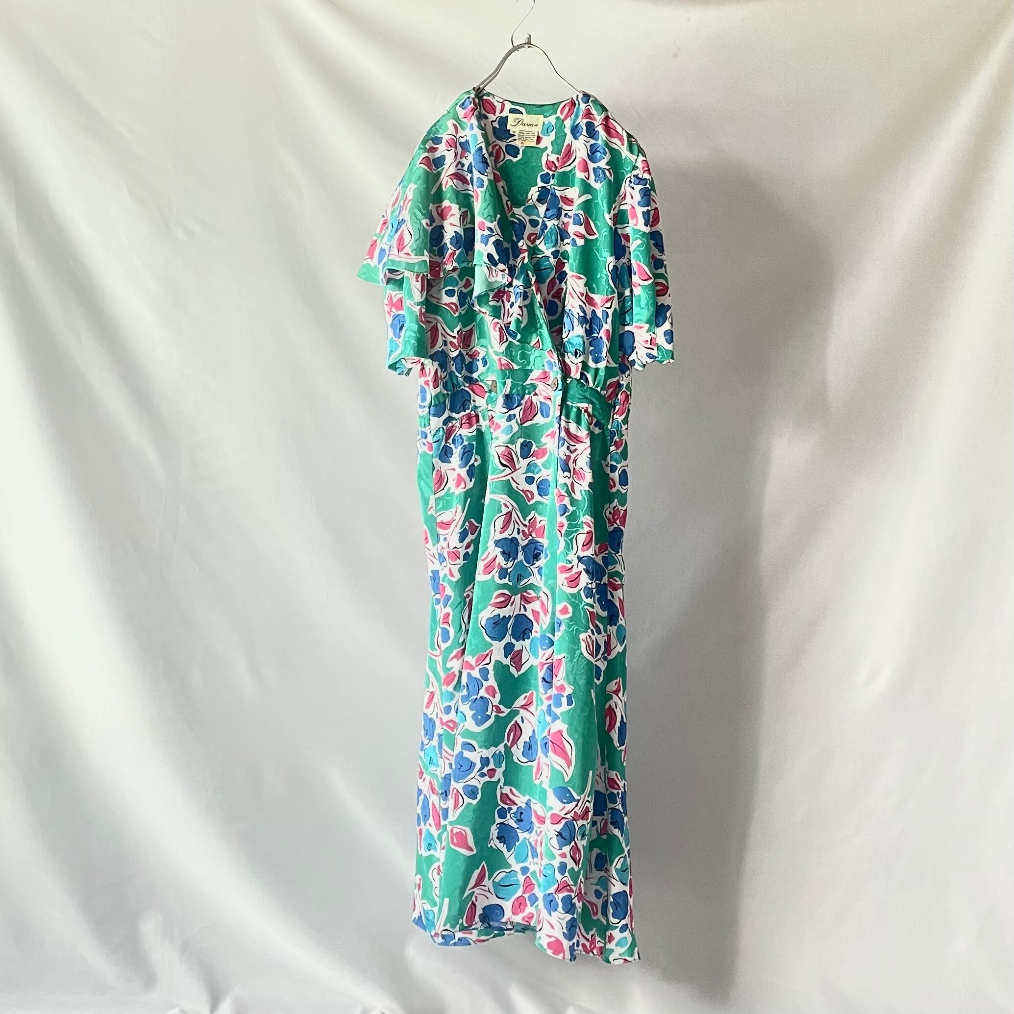 80s vintage 100% polyester green floral onepiece 80年代 グリーン 花柄 ポリエステル フリル マキシワンピース | &Dorothy used&vintage 古着屋