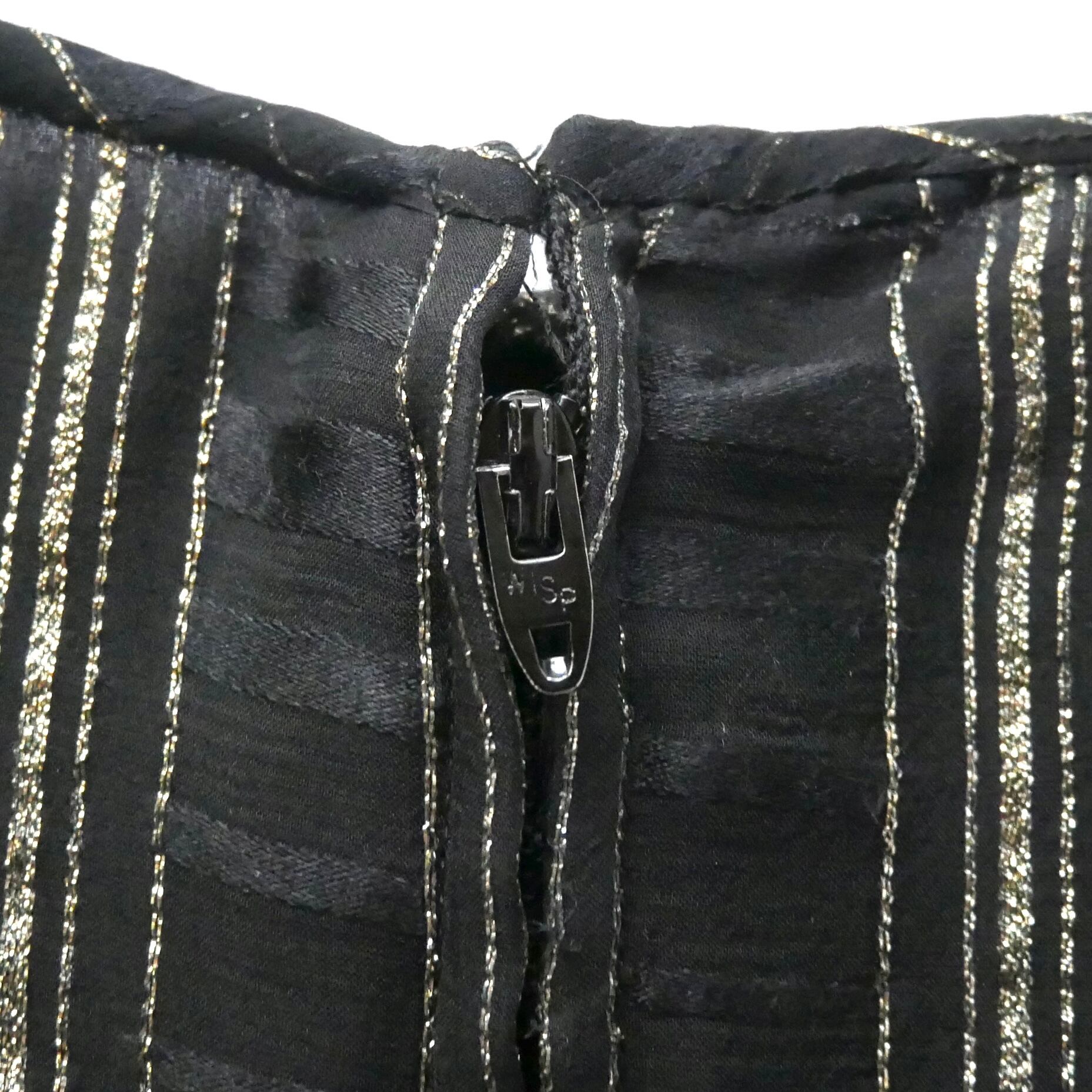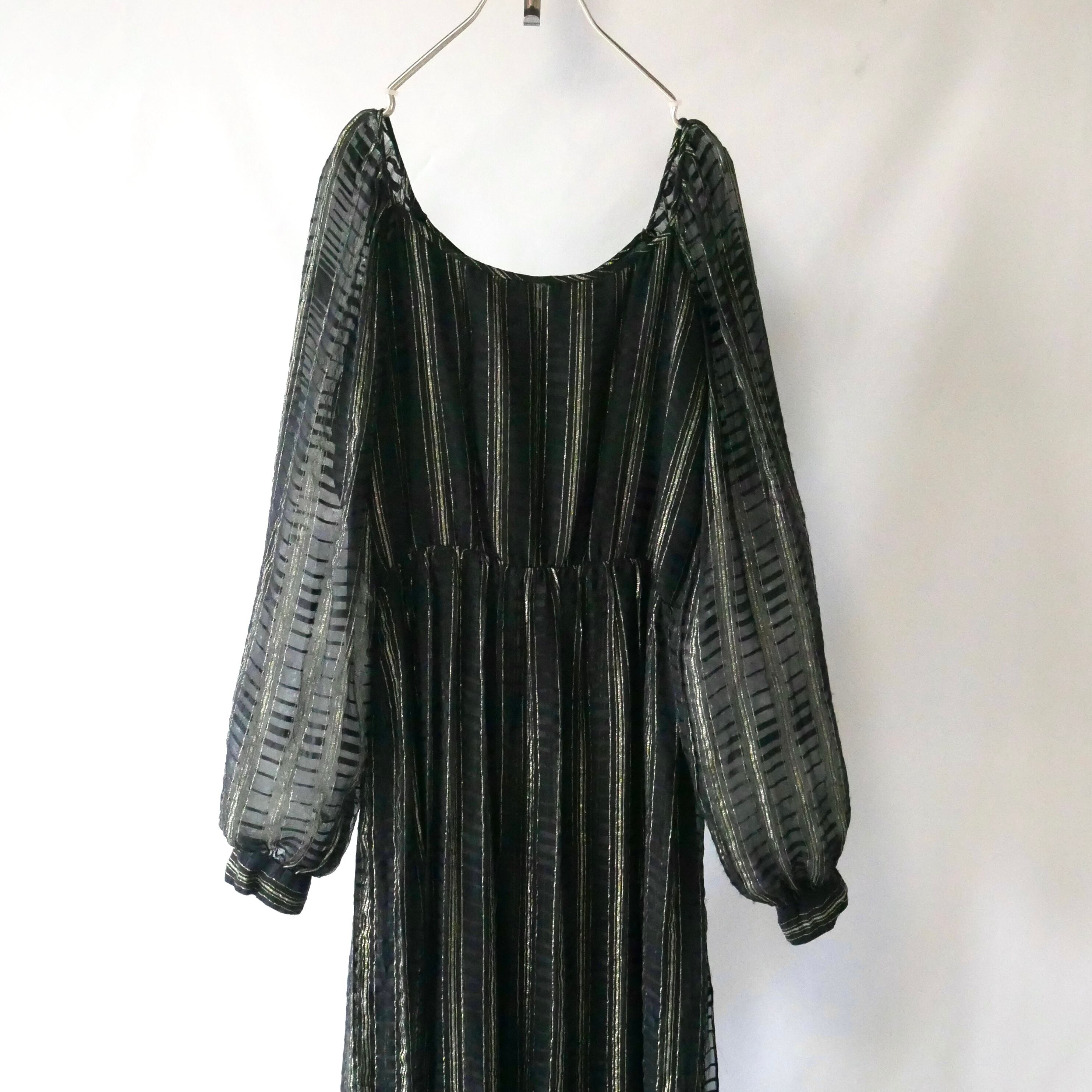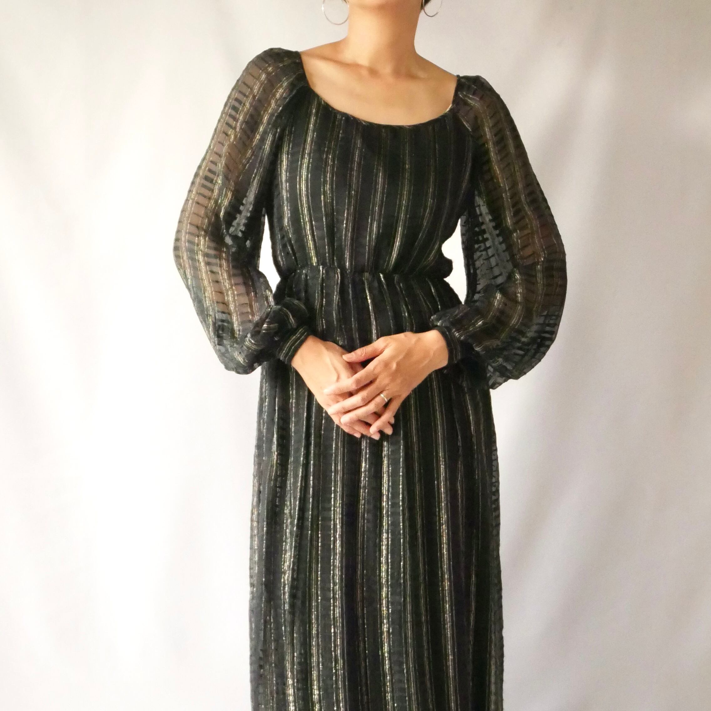 黒のシースルー地にゴールドのライン入りが素敵な70年代USA製ヴィンテージマキシワンピースです。