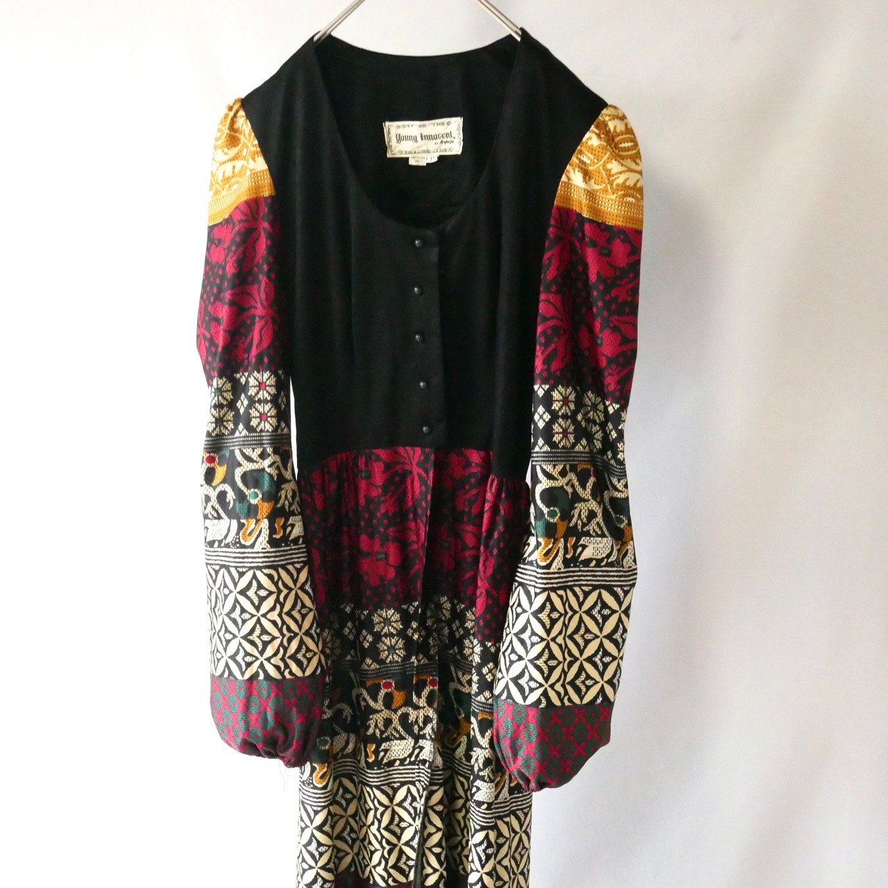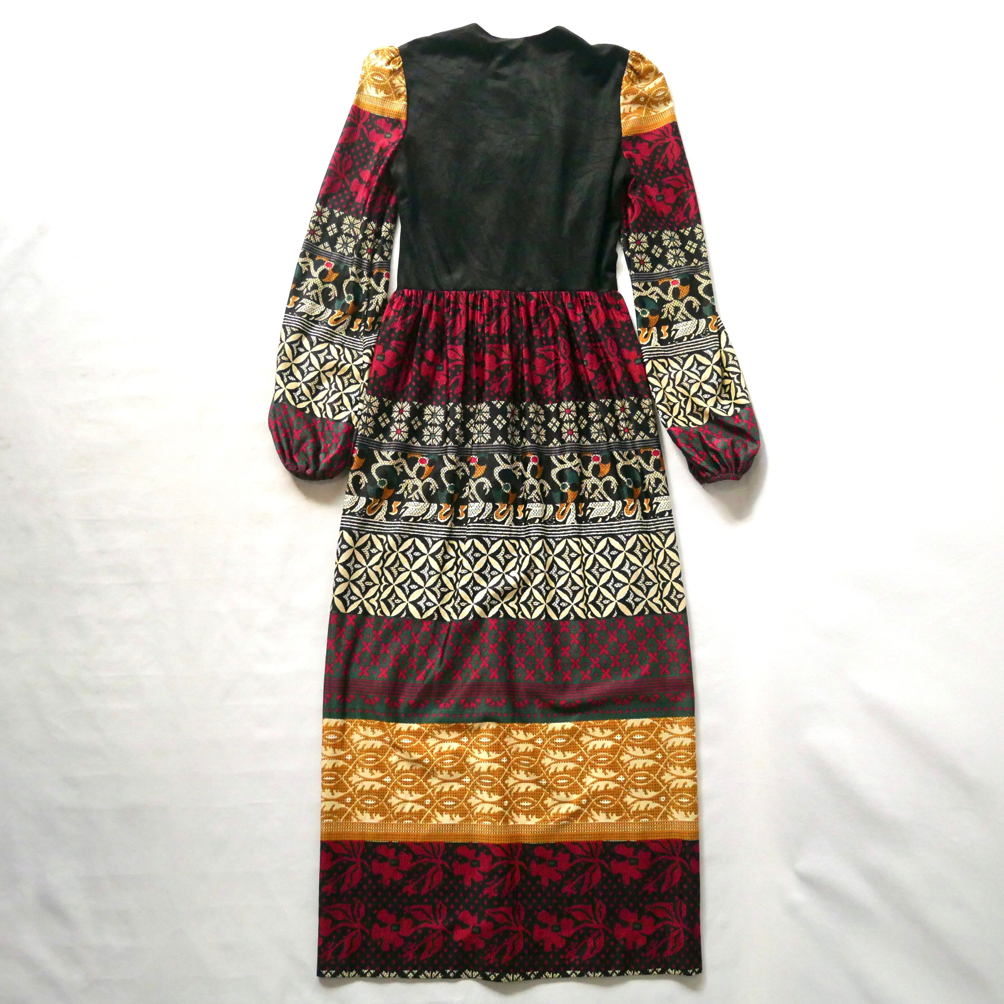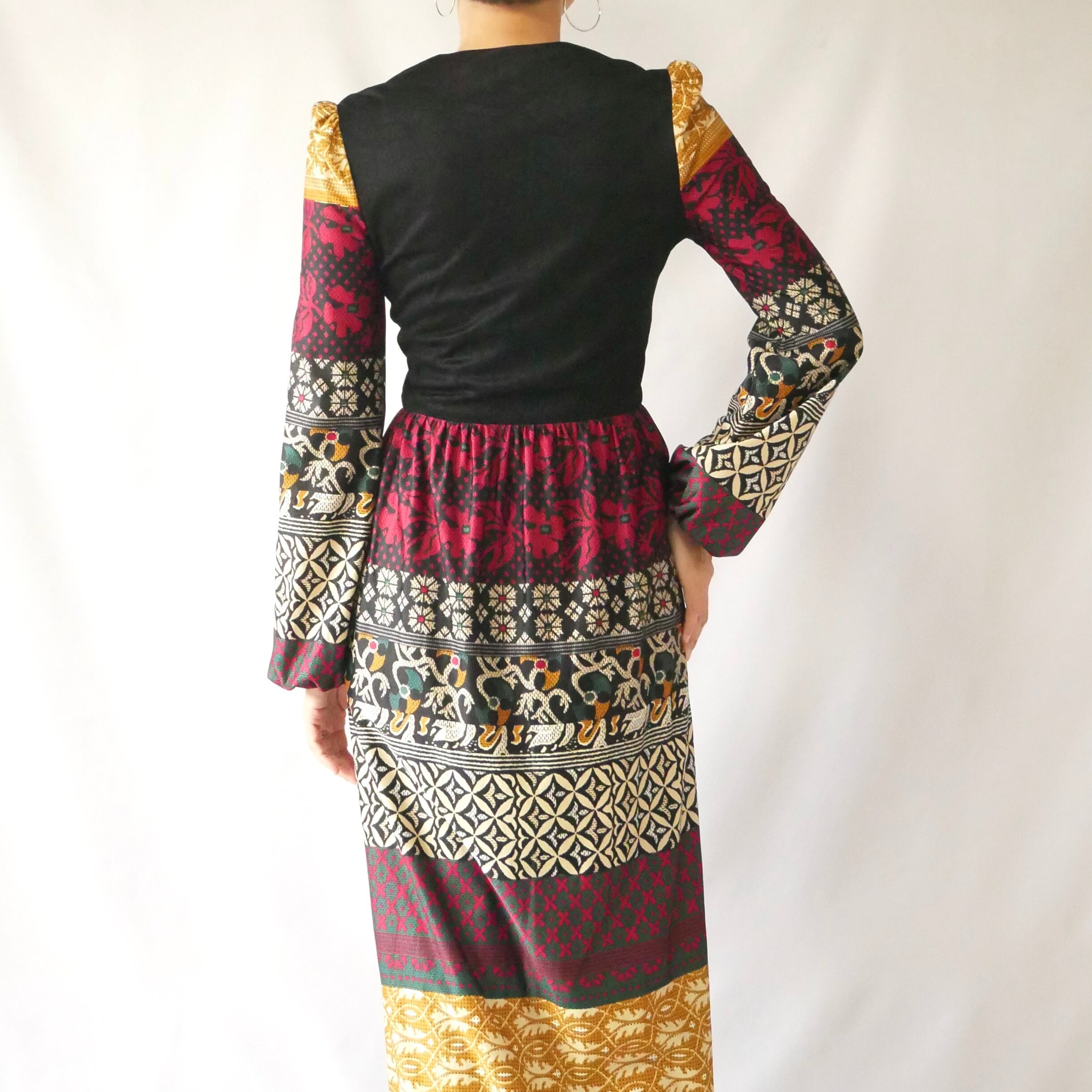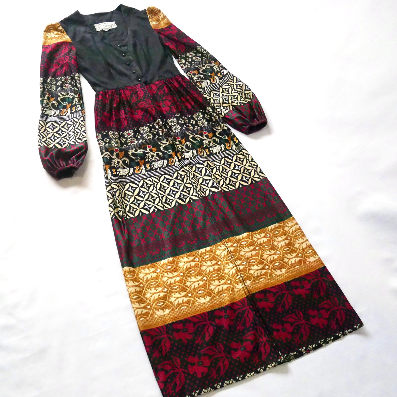 ふんわりしたバルーンスリーブに黒と花柄の切り替えが素敵な70年代マキシワンピースです。