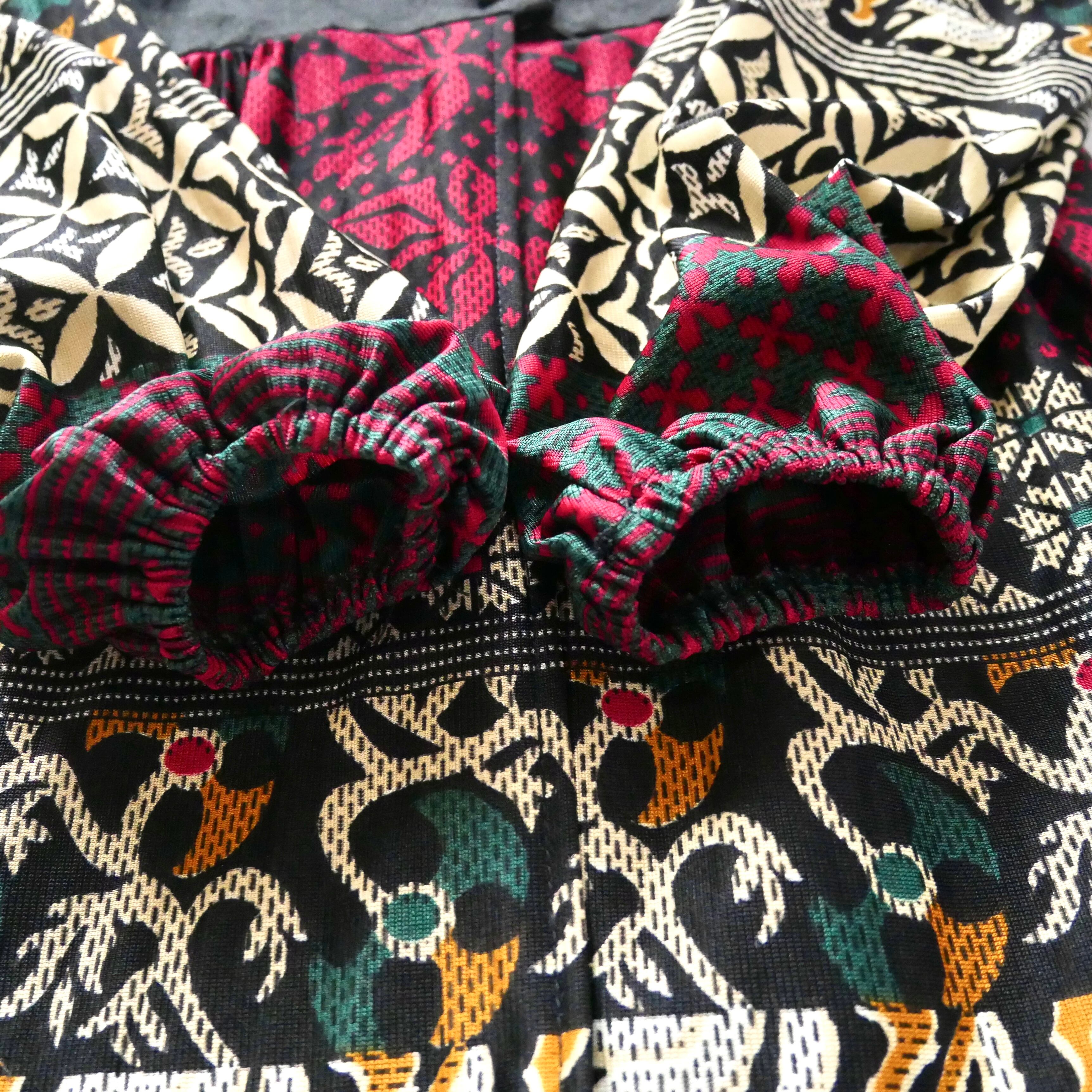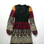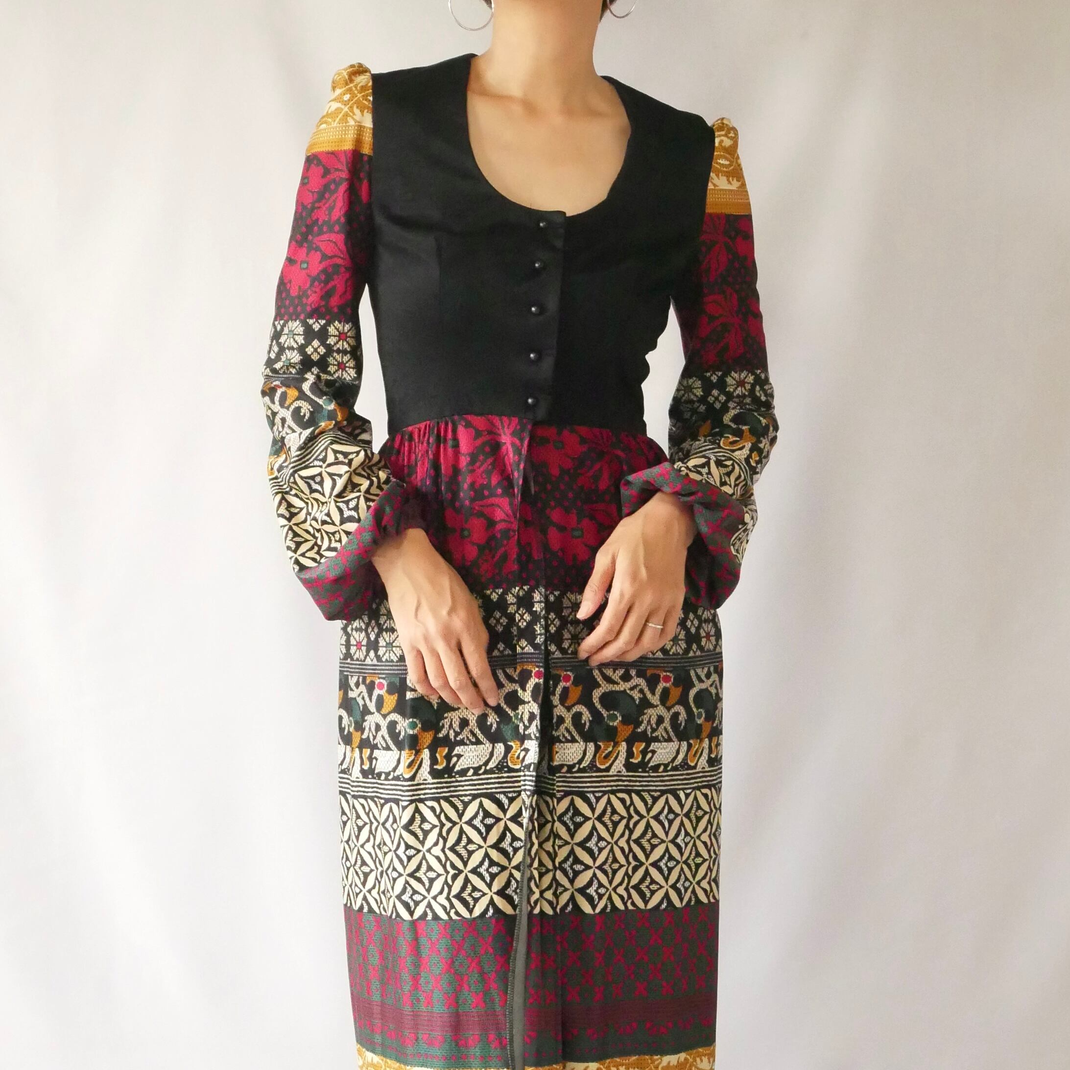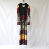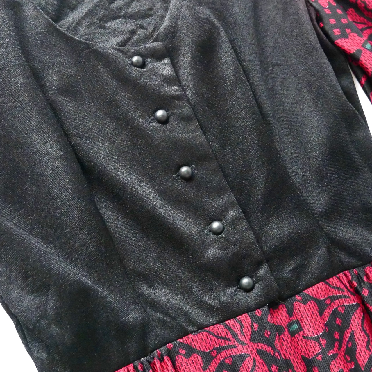 ふんわりしたバルーンスリーブに黒と花柄の切り替えが素敵な70年代マキシワンピースです。
