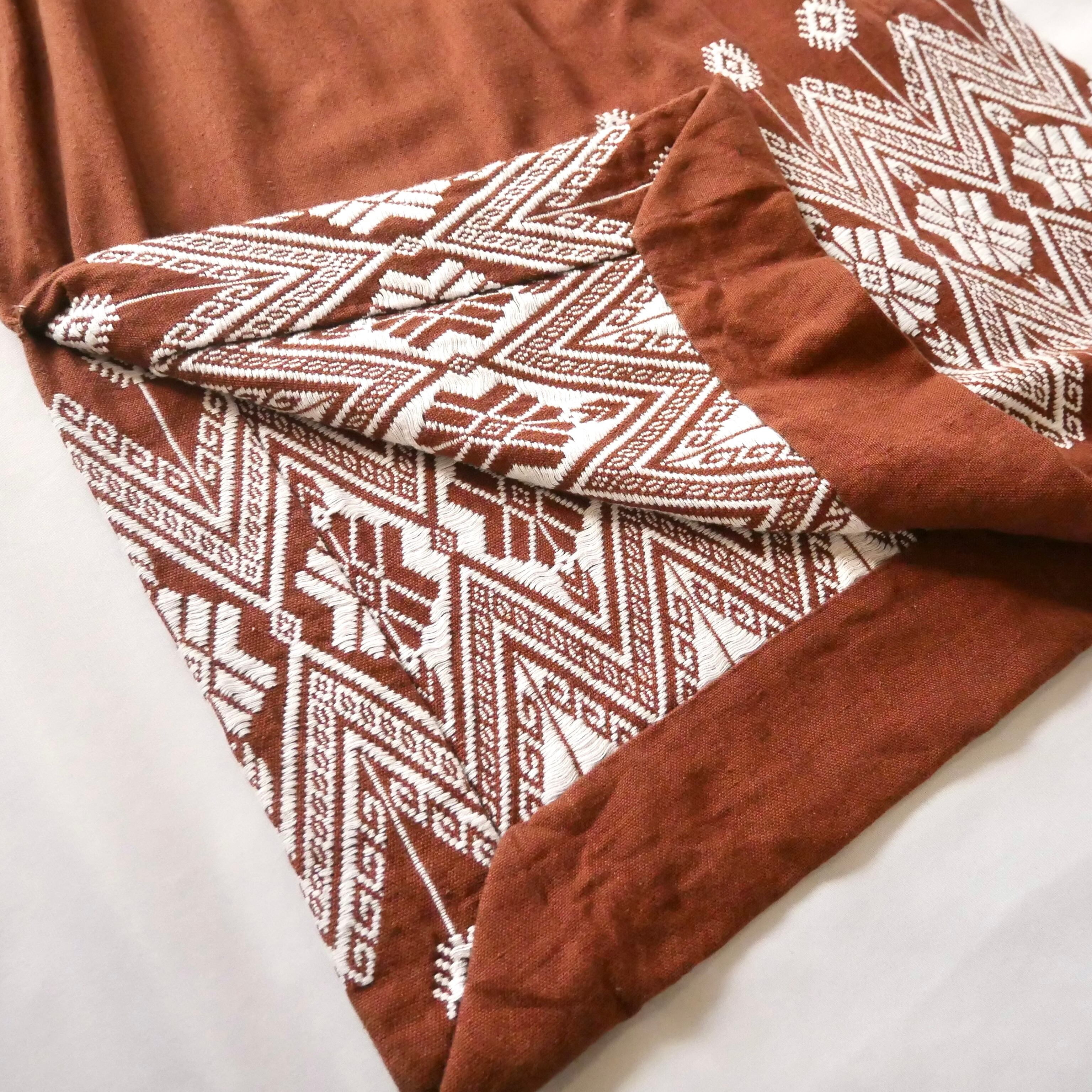 落ち着いたブラウンカラーに豪華な刺繍がびっしりと入った70年代頃のグアテマラ刺繍ワンピースです。