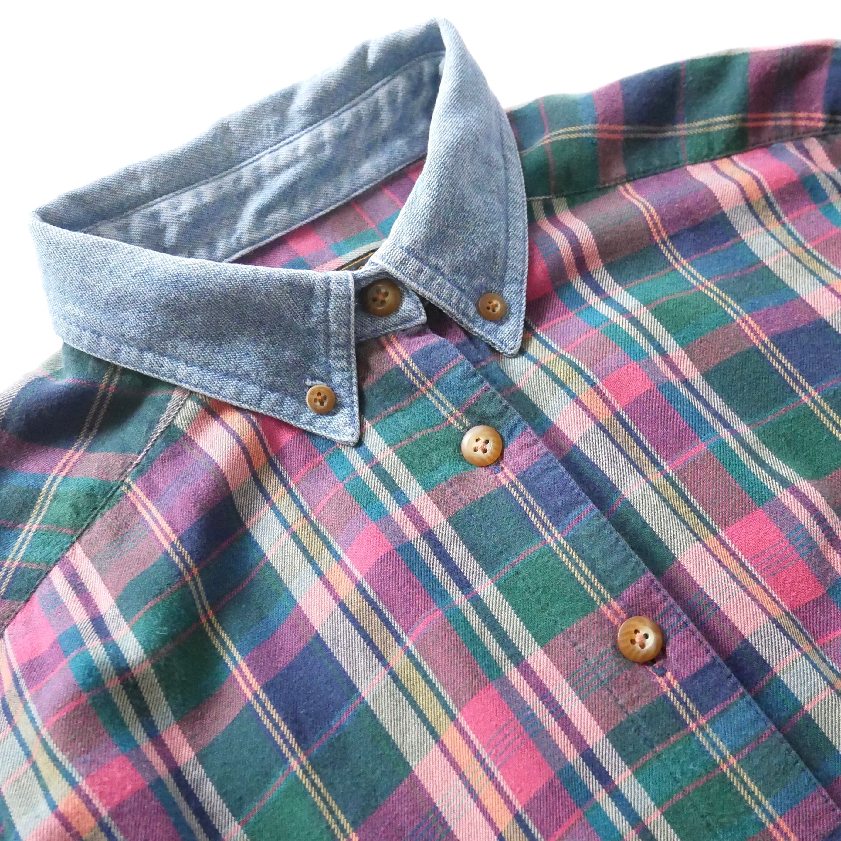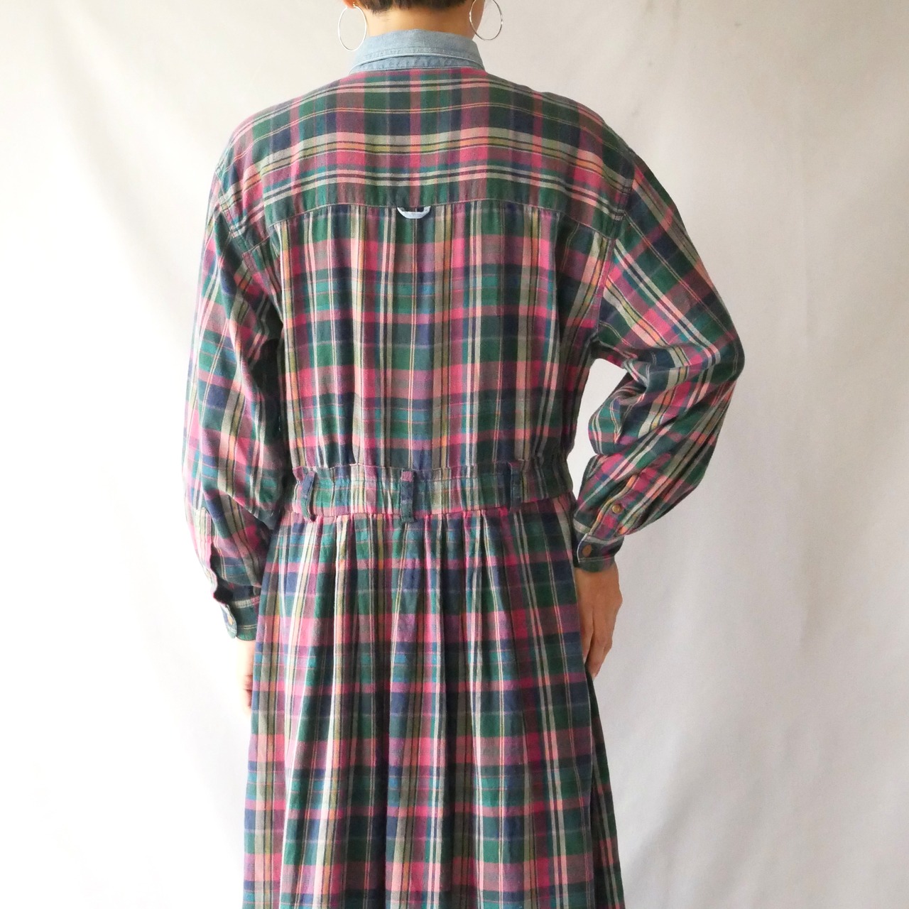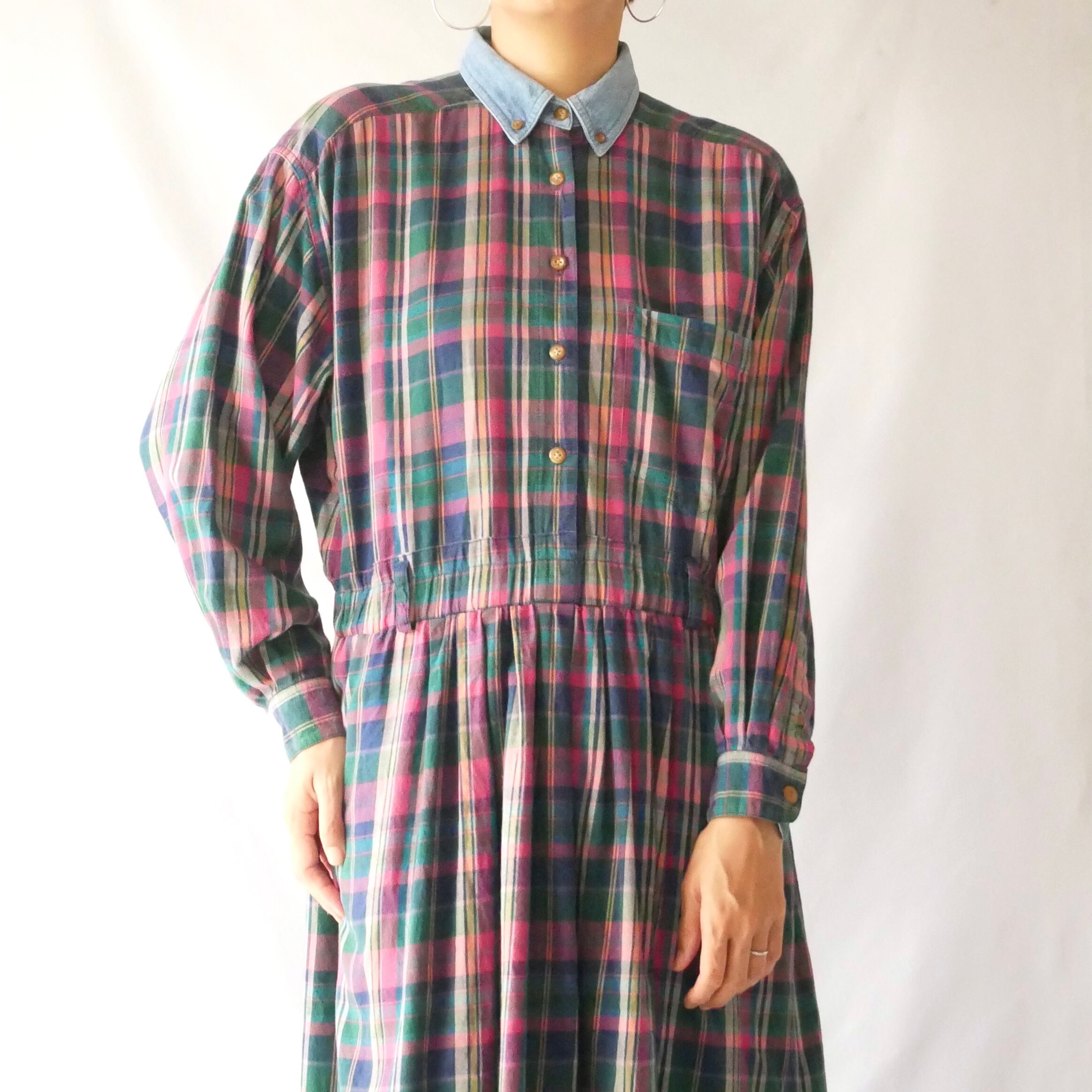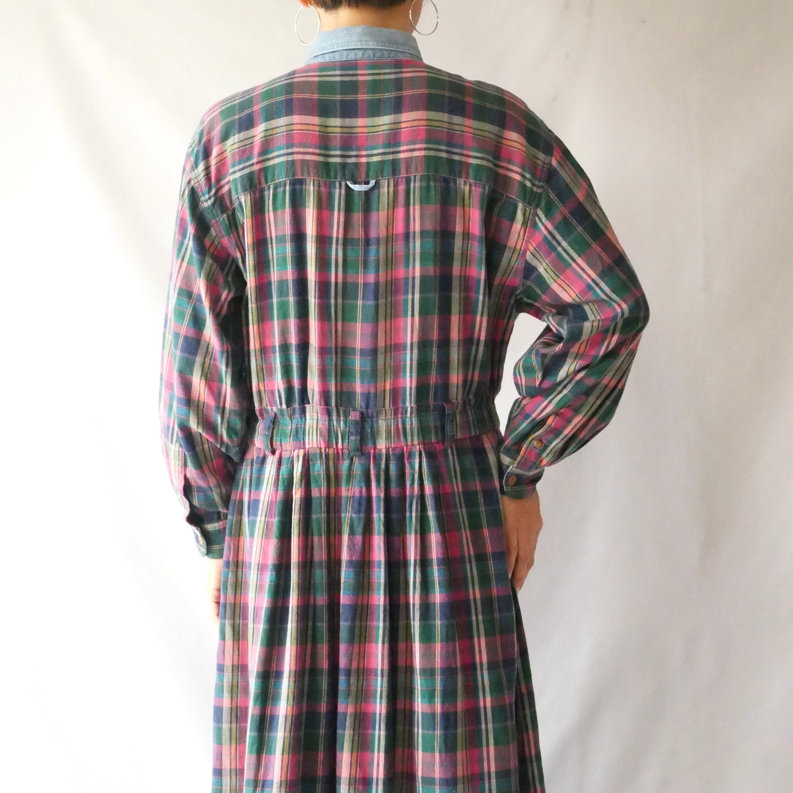 EddieBauer check nel maxi onepiece エディーバウワー デニム襟 チェックネル素材 マキシワンピース