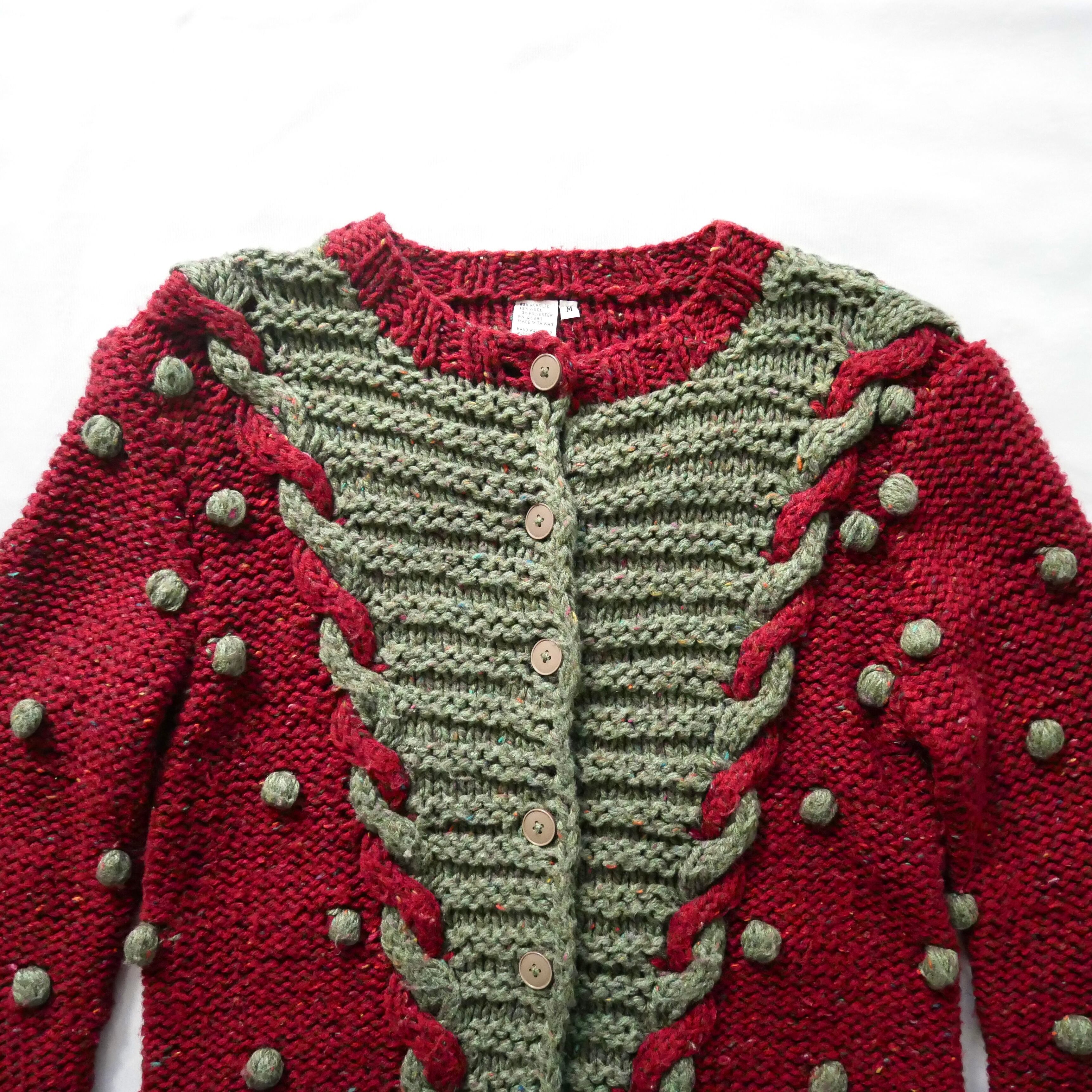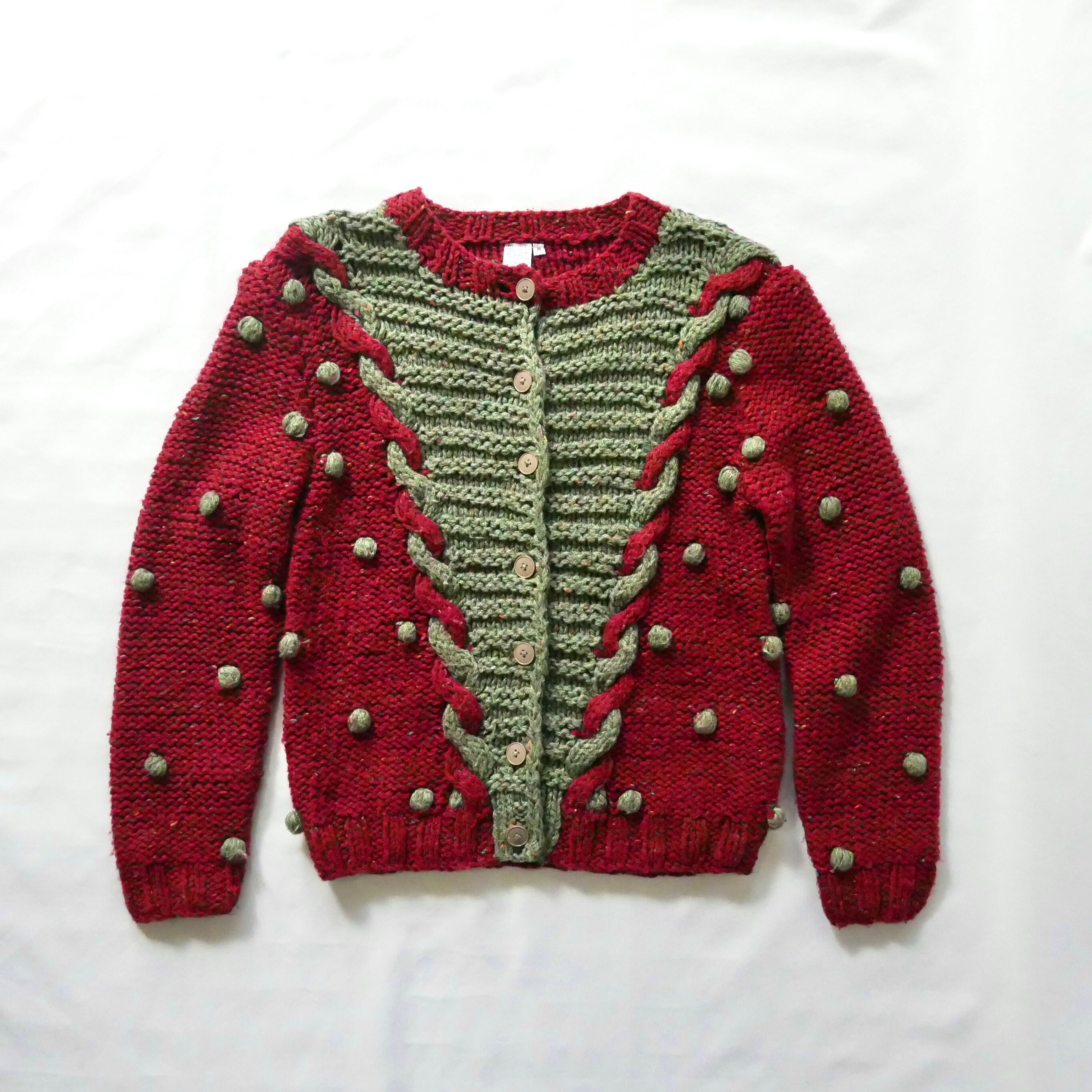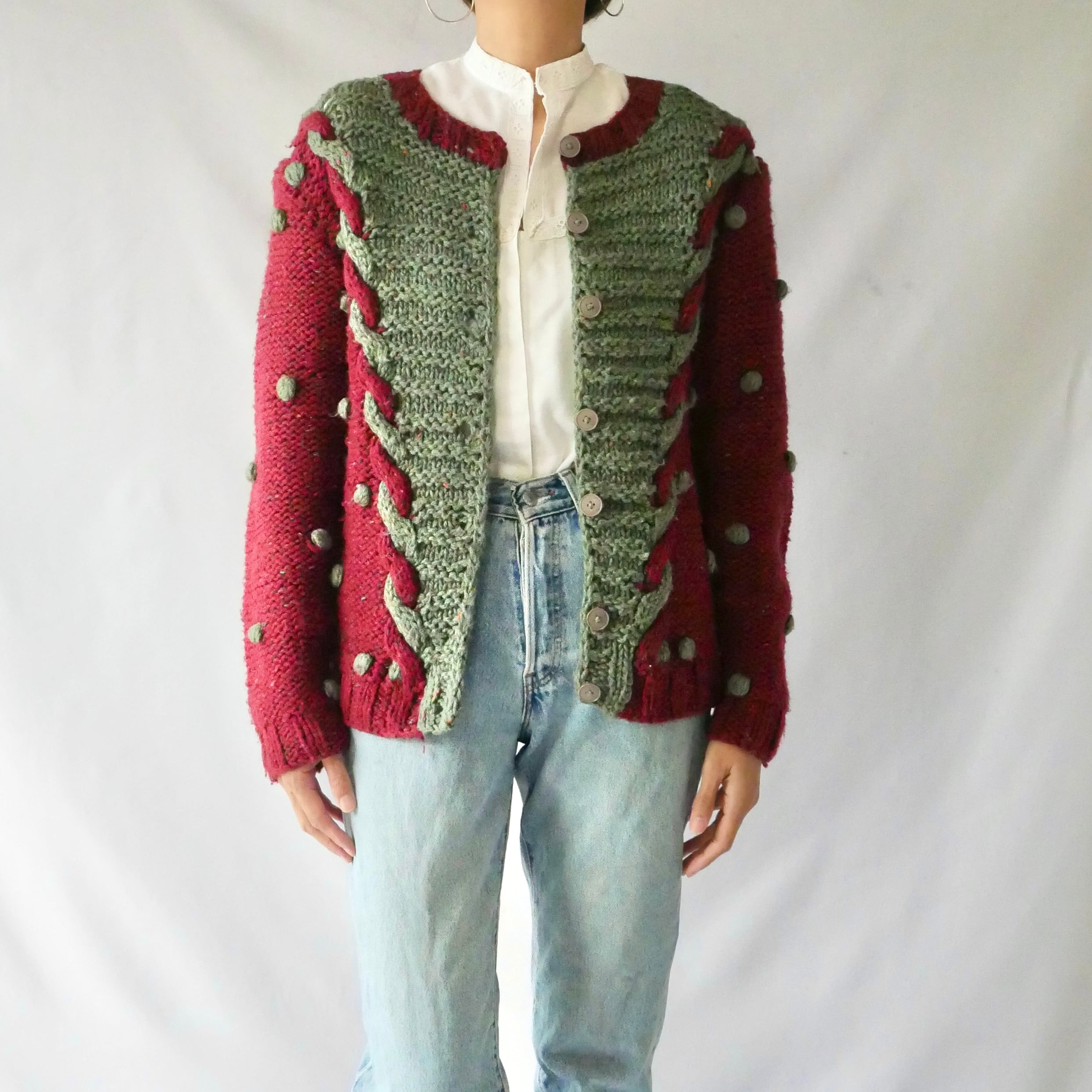 80s burgundy green popcorn knit cardigan 80年代 ヴィンテージ エンジ グリーン ポップコーン ポンポン ニットカーディガン