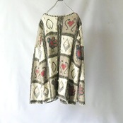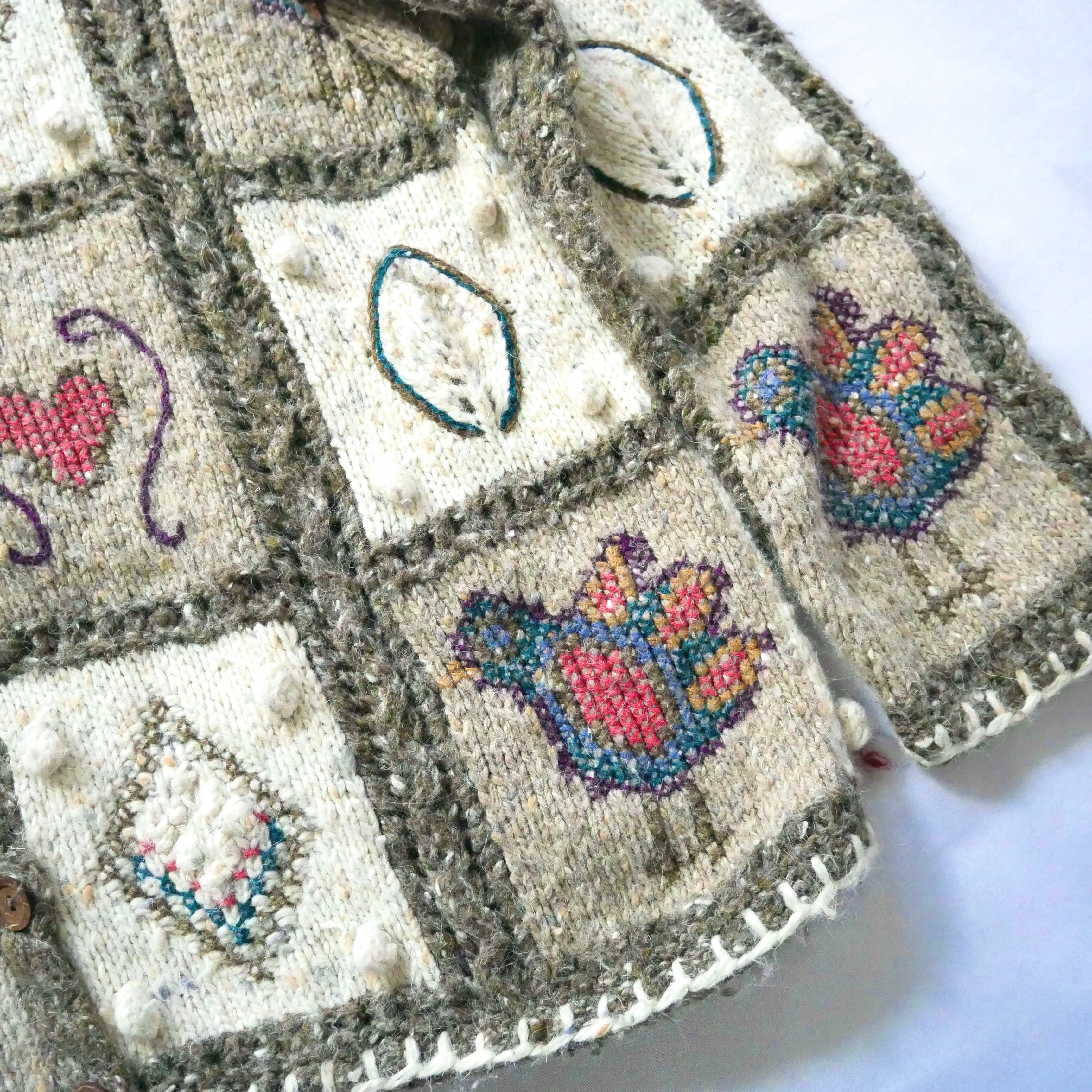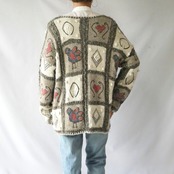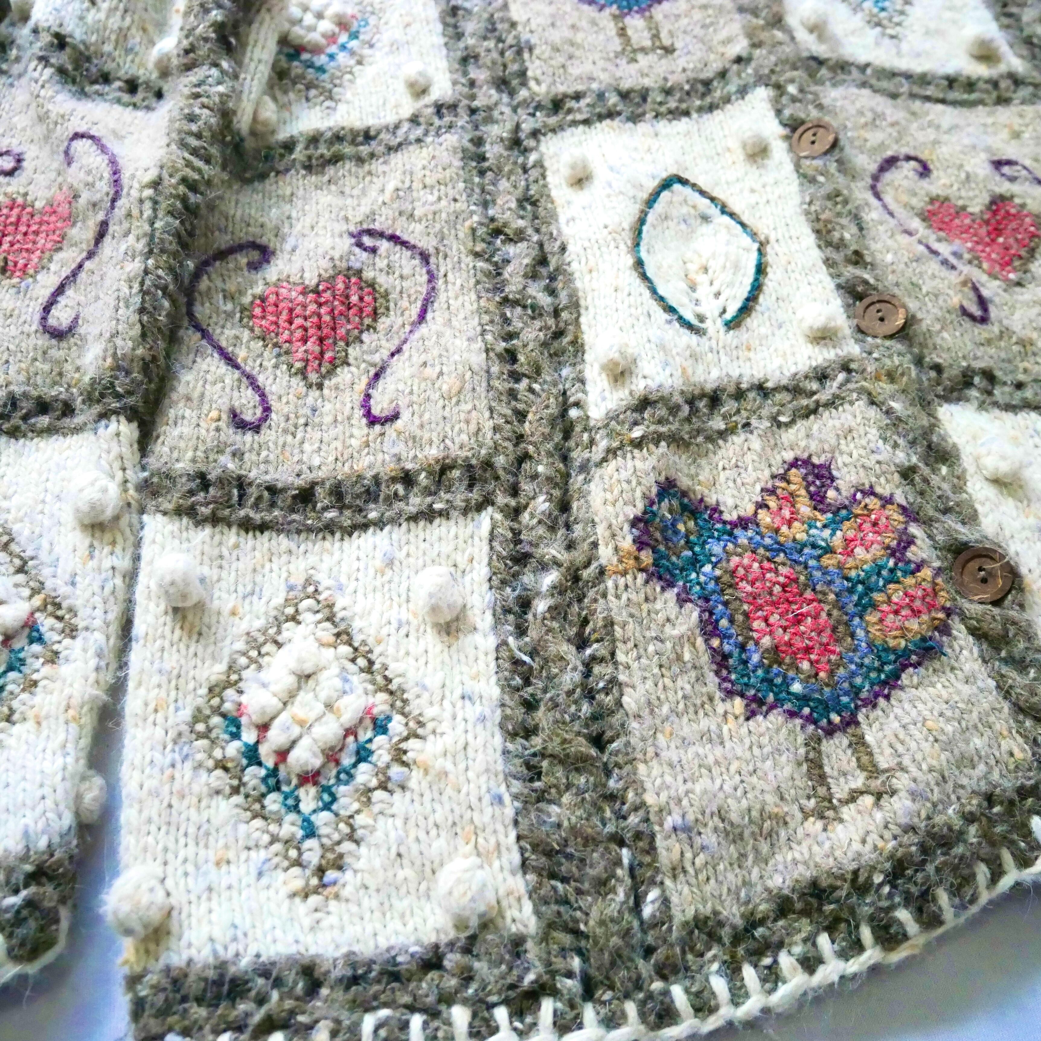 ハートや鳥、ひし形、葉っぱなど可愛いモチーフが盛りだくさんなパッチワークニットカーディガンです。