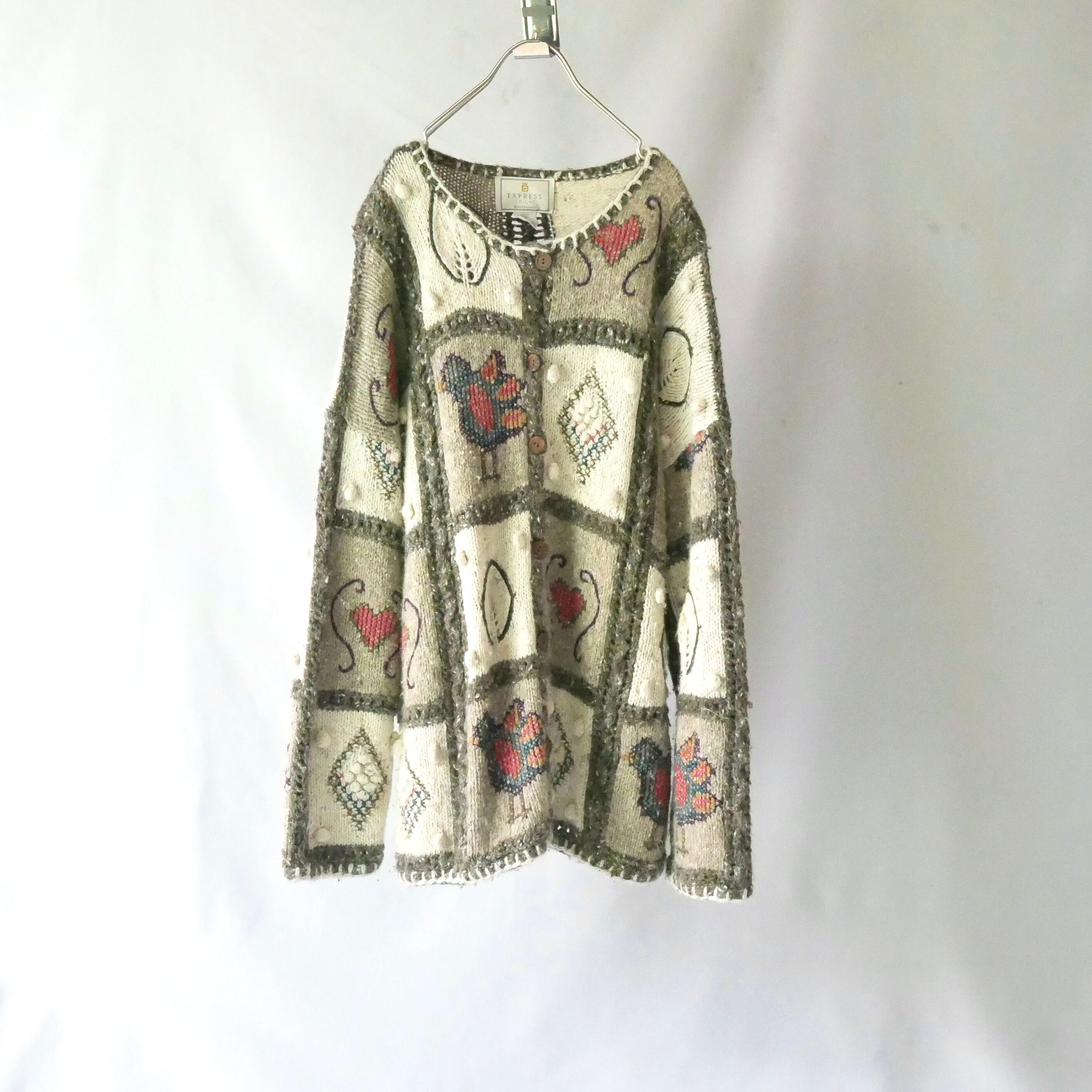 EXPRESS bird heart leaf patchwork cardigan エクスプレス 鳥 ハート 葉っぱ モチーフ パッチワーク ニットカーディガン