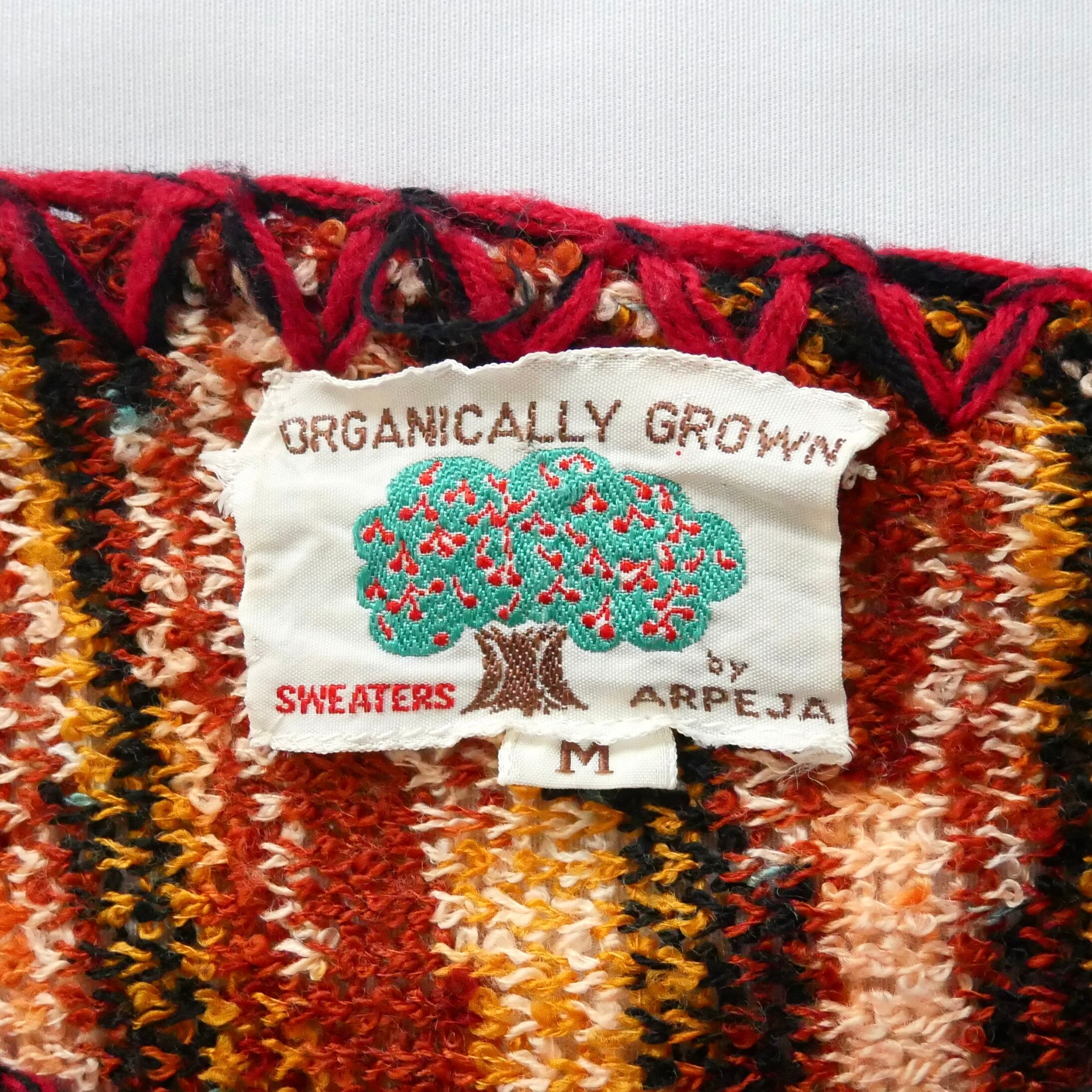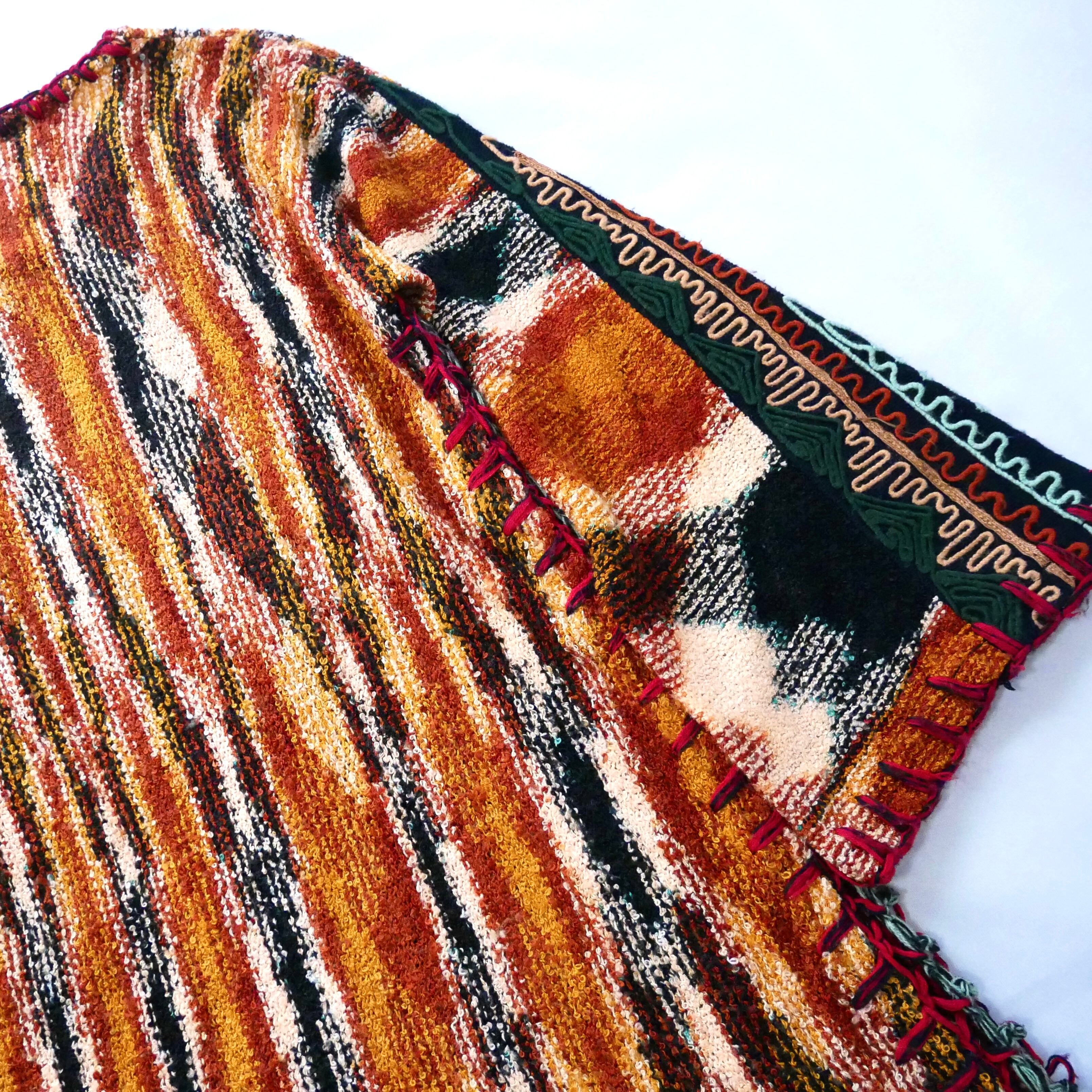 70年代らしいミックスカラーのカラーリングと袖のコード刺繍、脇の鍵編みなど可愛い要素満載のニットです。