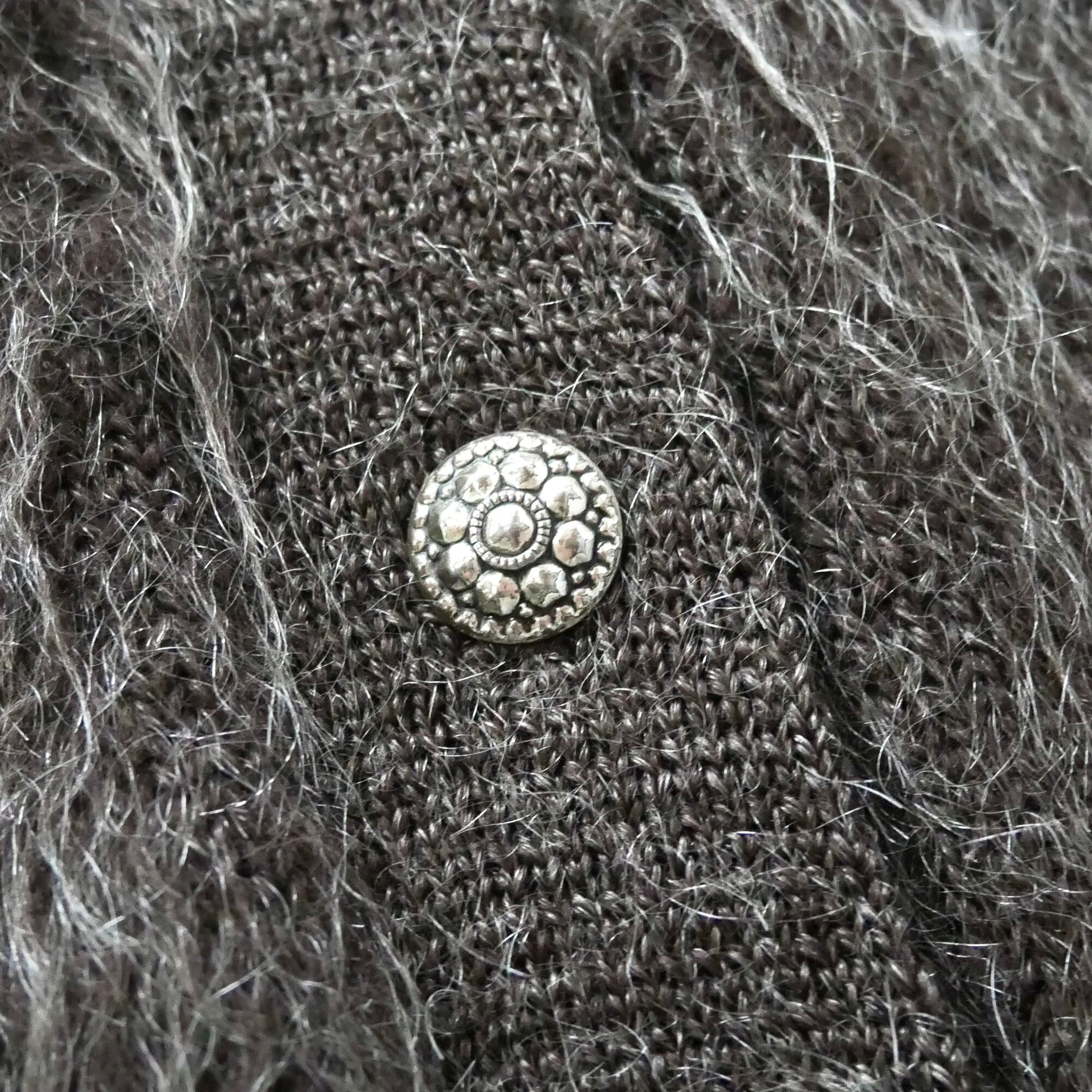 毛足の長いふわふわしたウールに凝った細工のボタンも可愛いユーロヴィンテージシャギーニットカーディガンです。