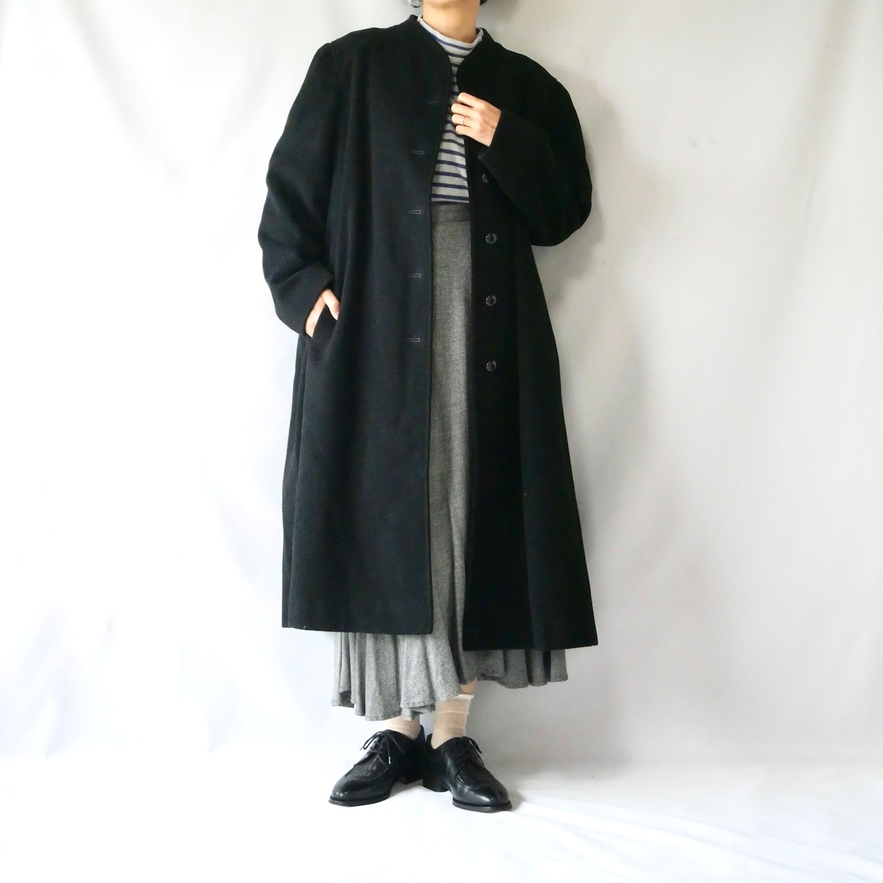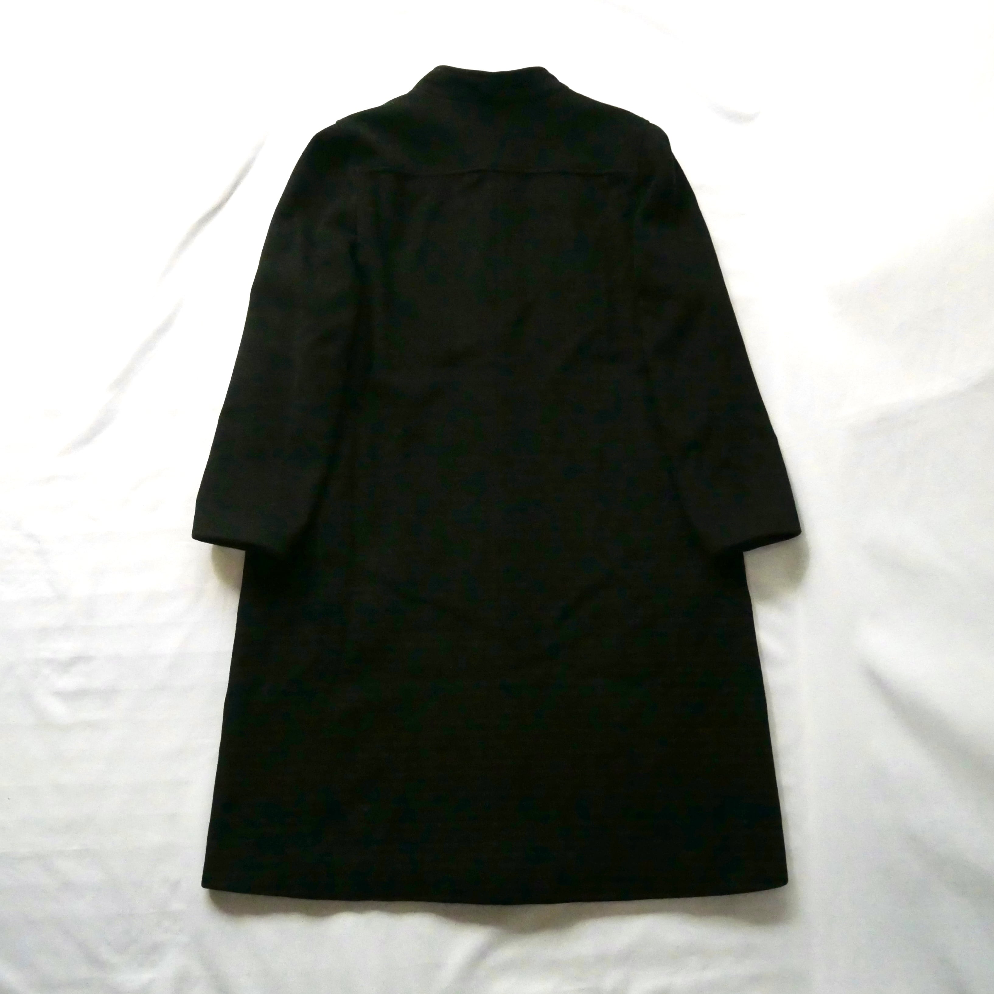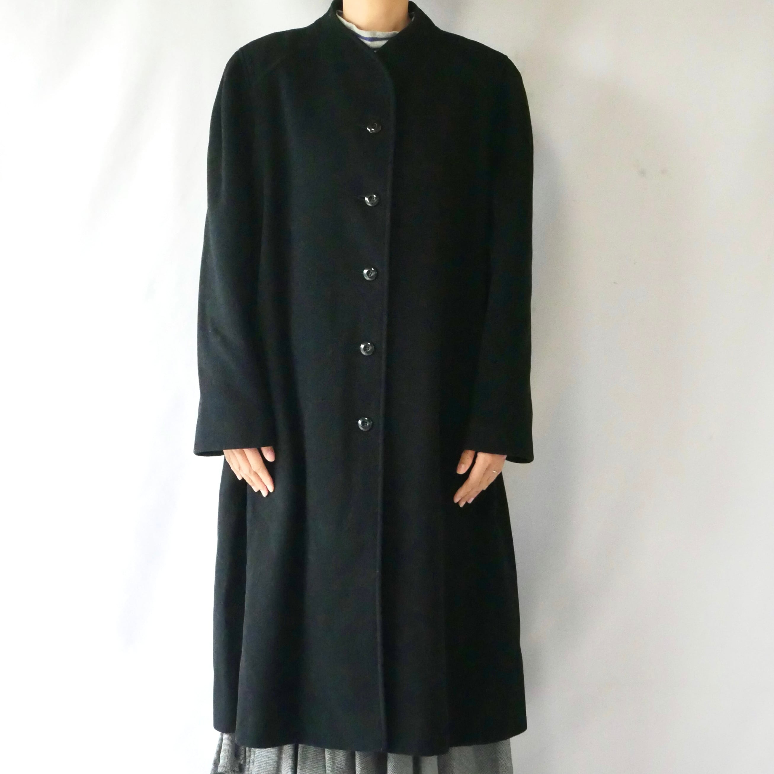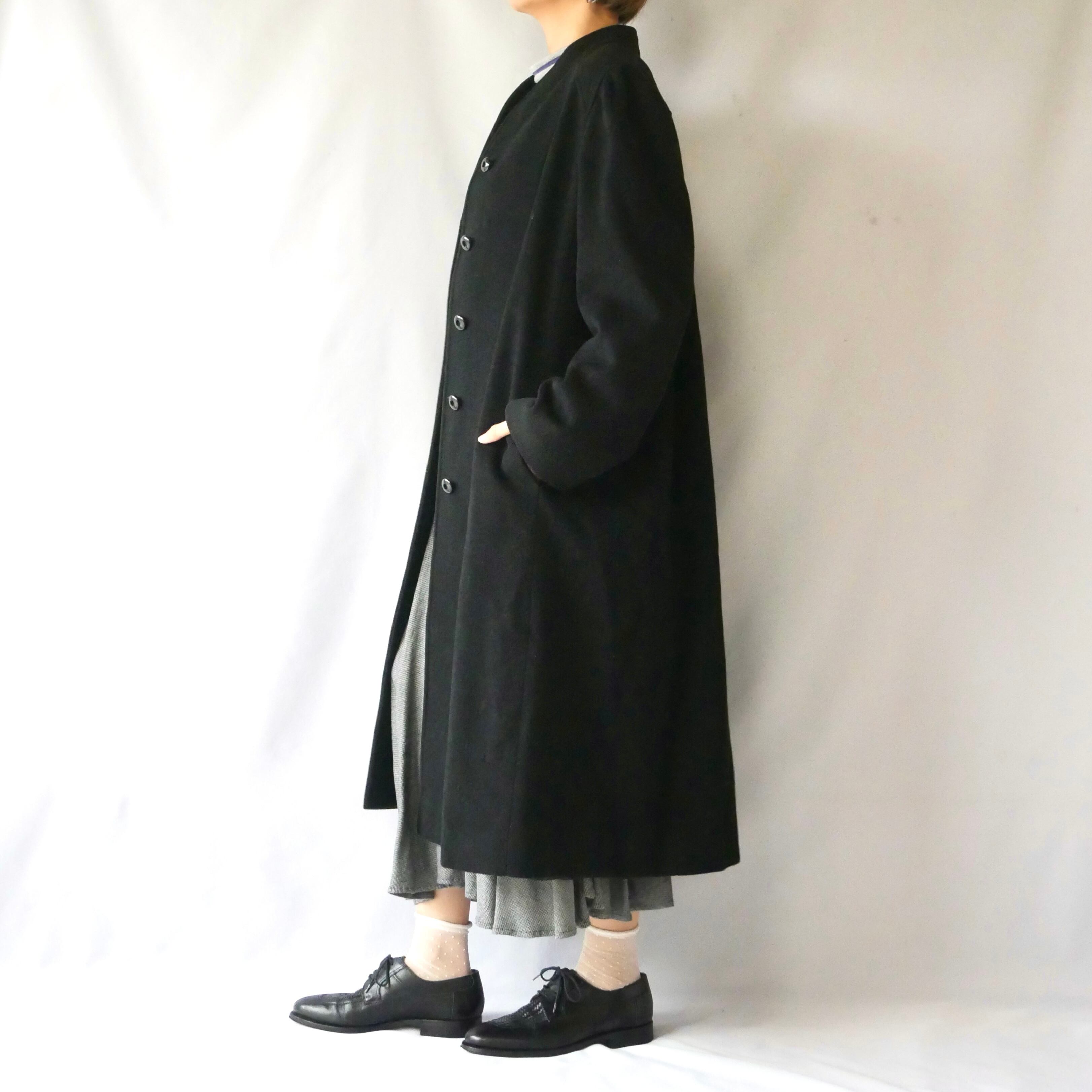 首元がハイネックなデザインで素敵な80年代頃のUSA製黒ウールコートです。