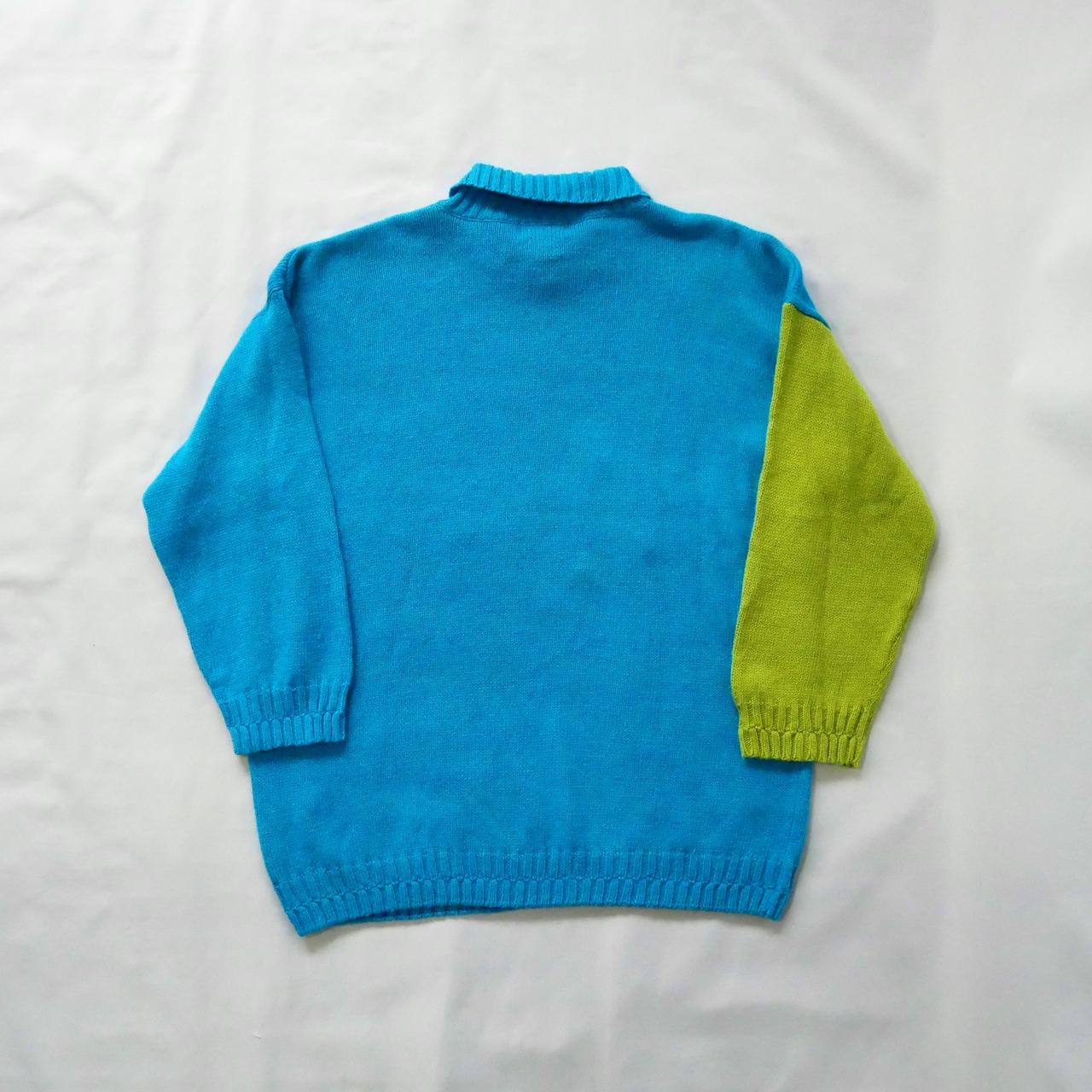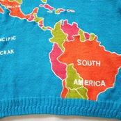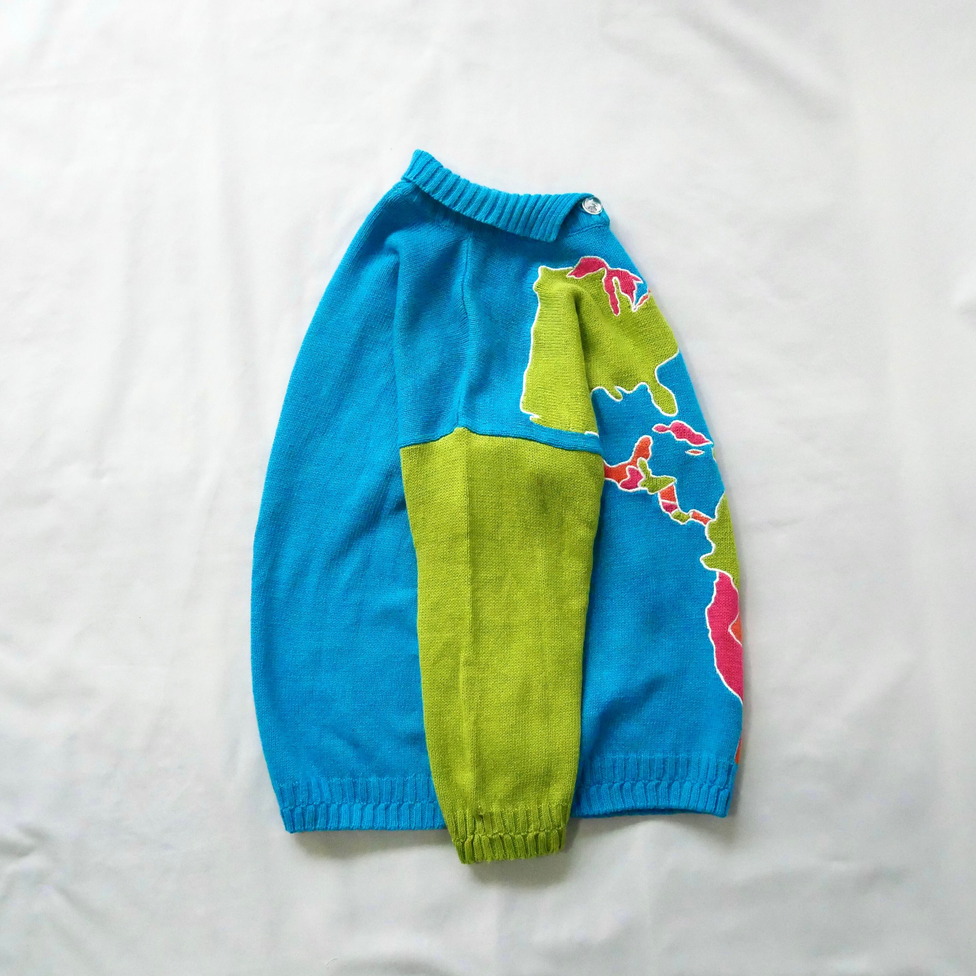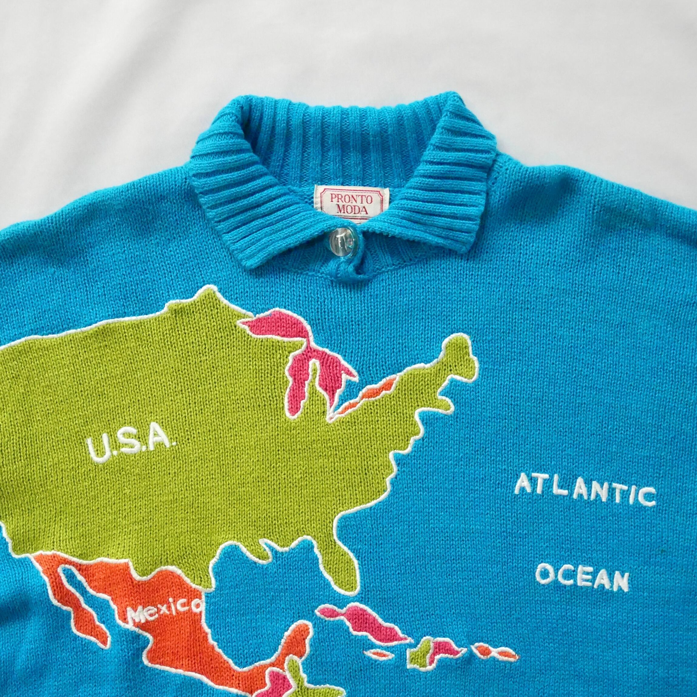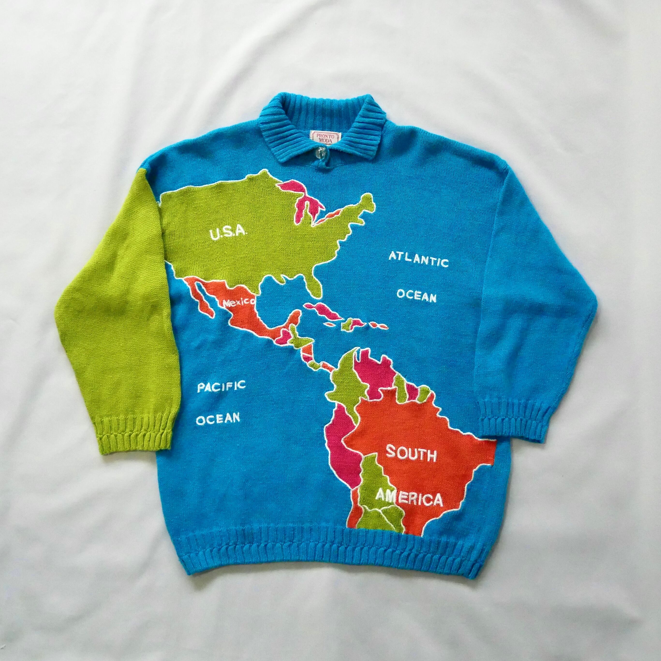 北米、南米大陸がカラフルな地図にて編み込まれている可愛いニットです。