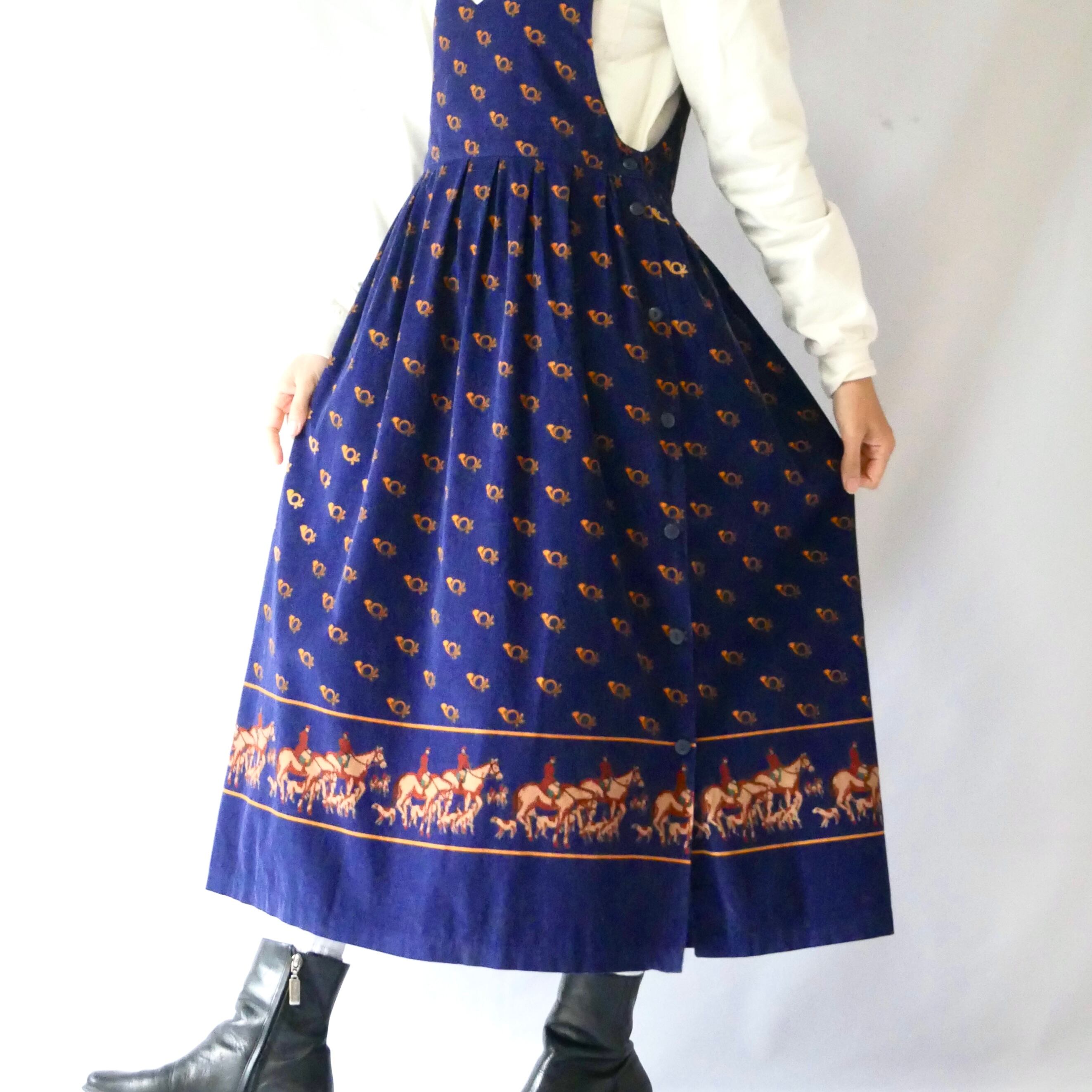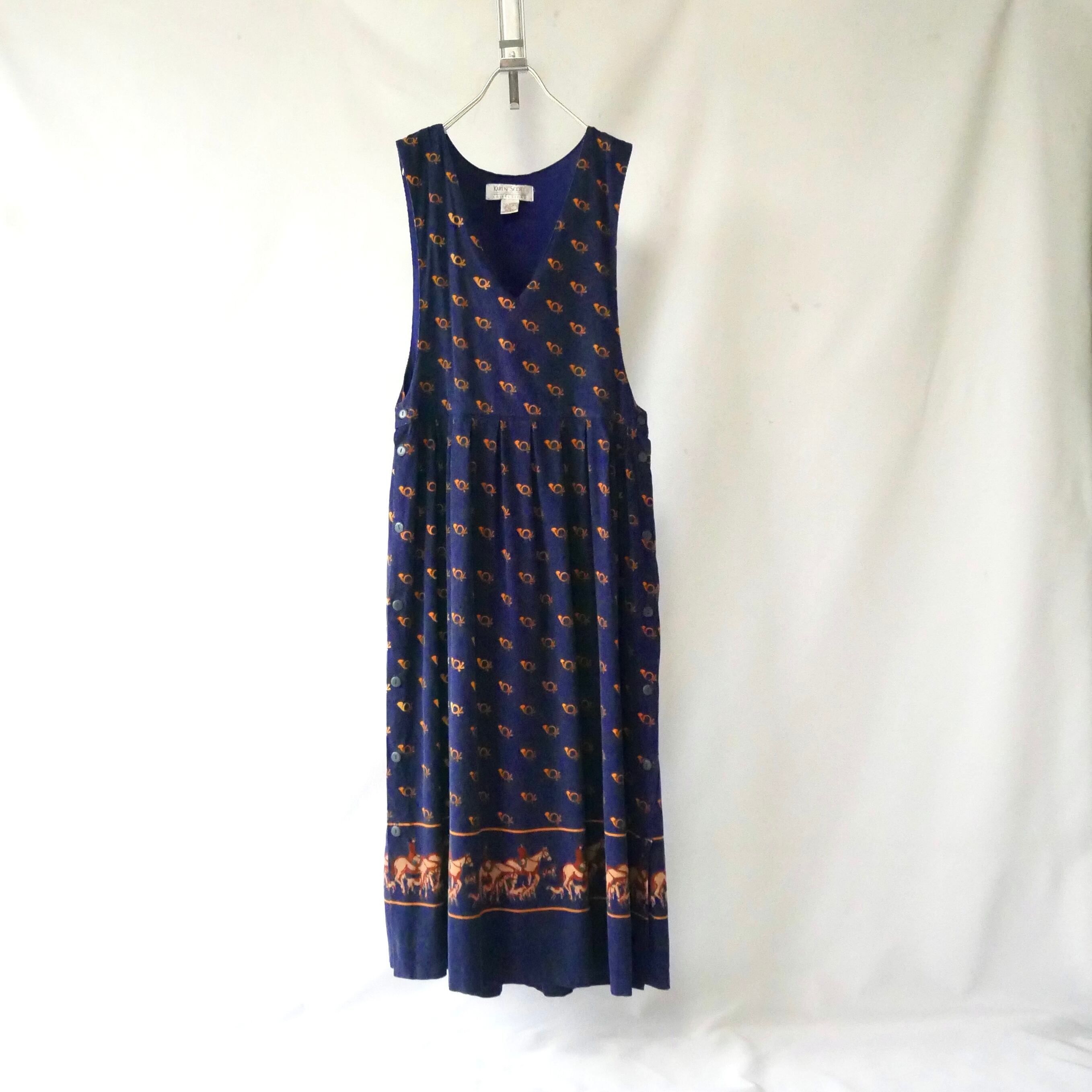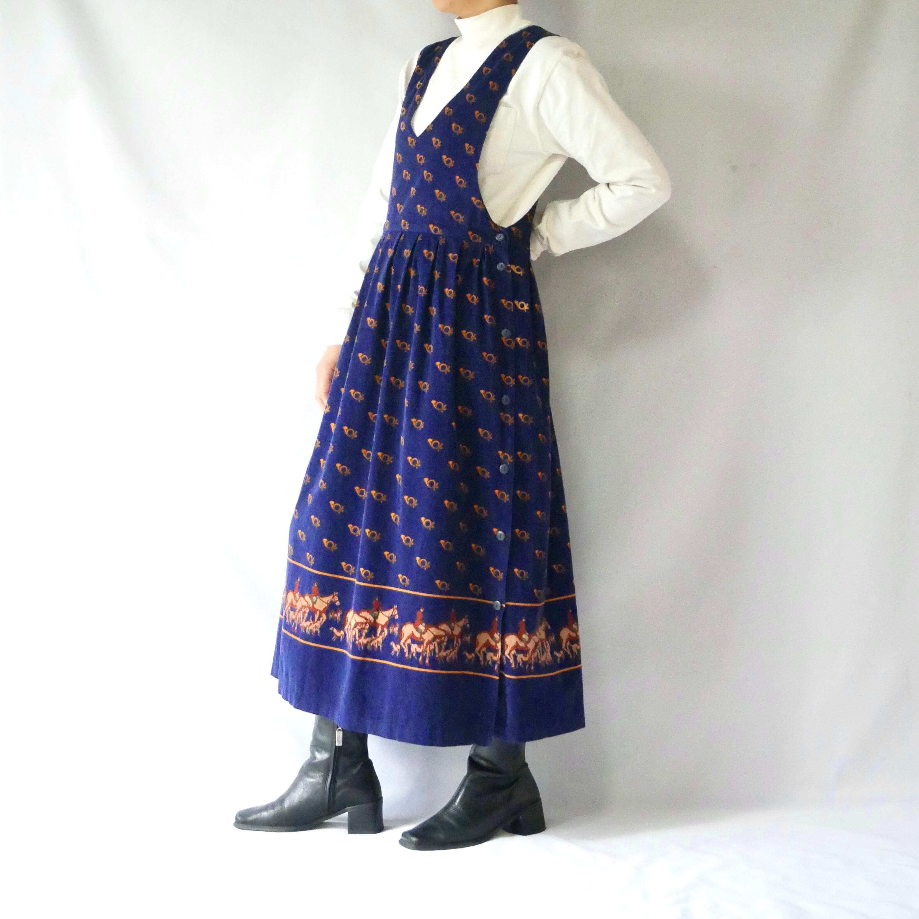 Karen Scott trumpet navy corduroy onepiece カレンスコット ネイビー トランペット 馬 総柄 コーデュロイ ワンピース