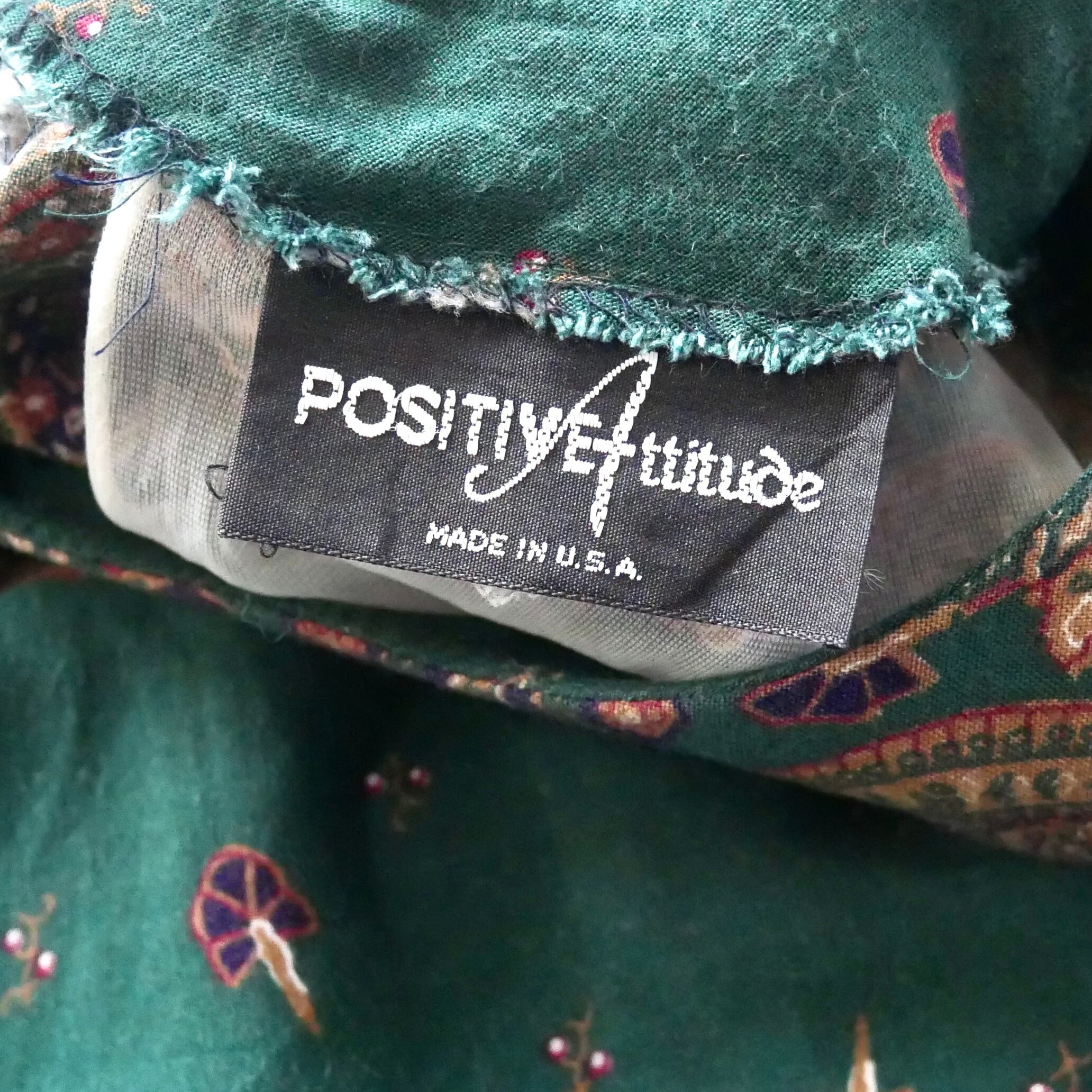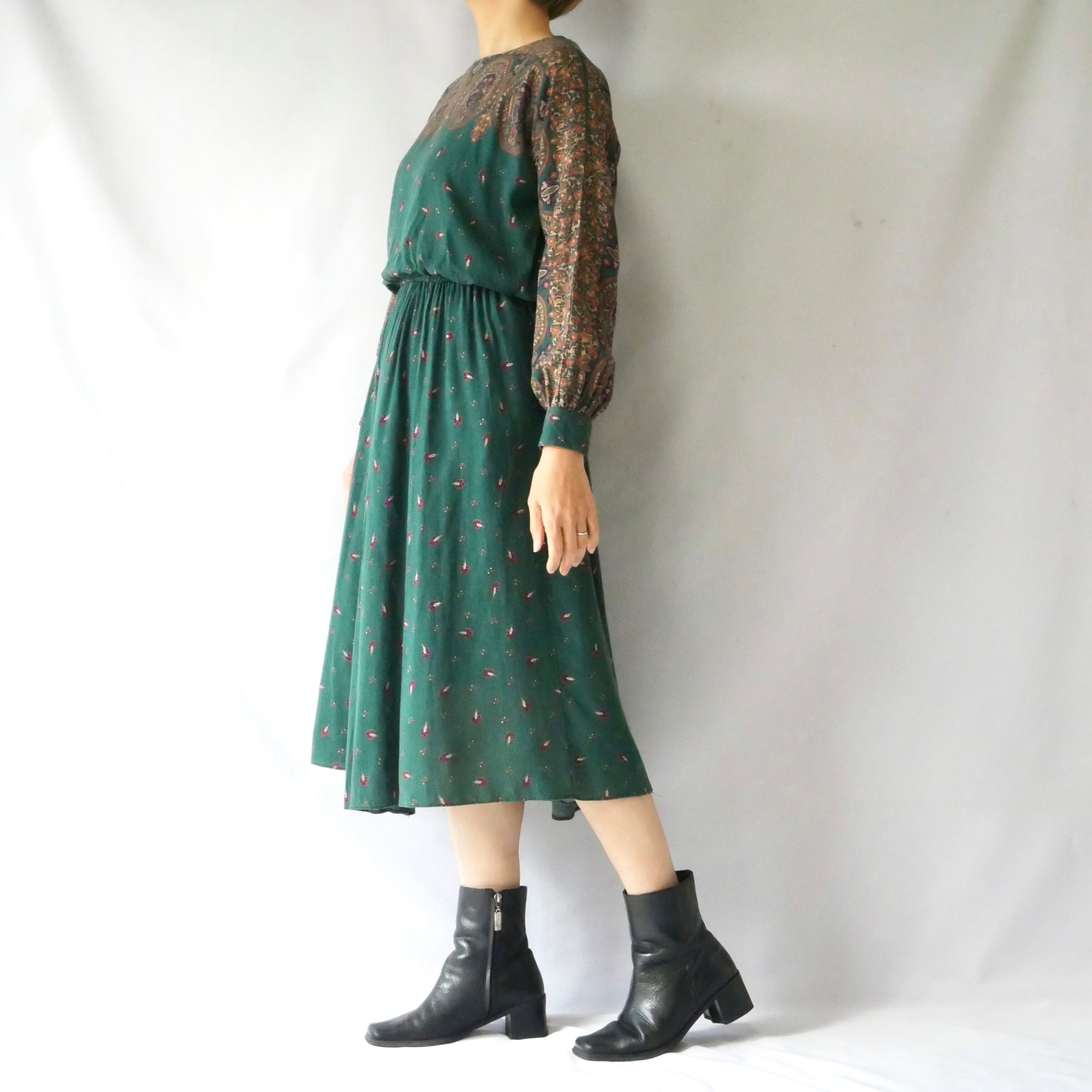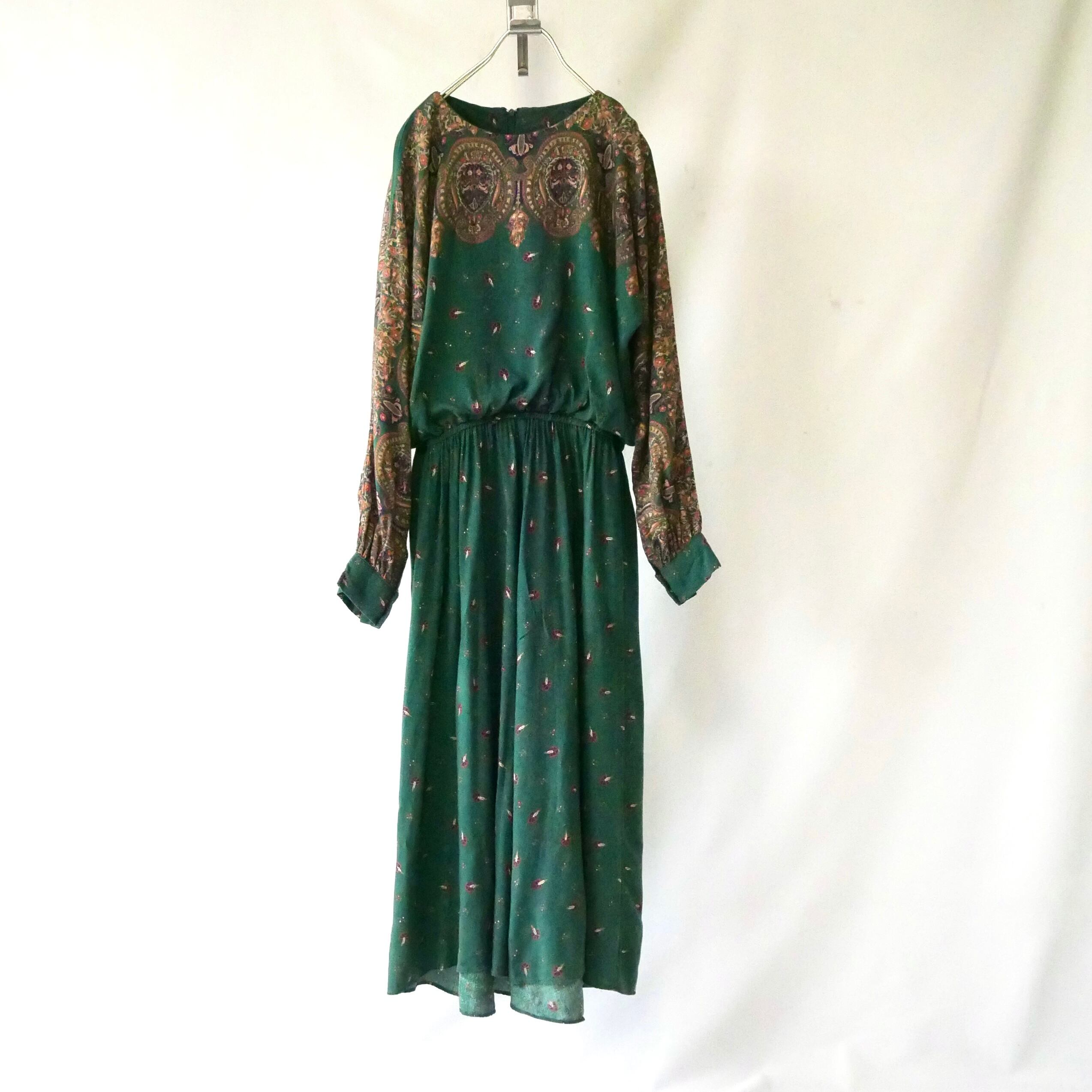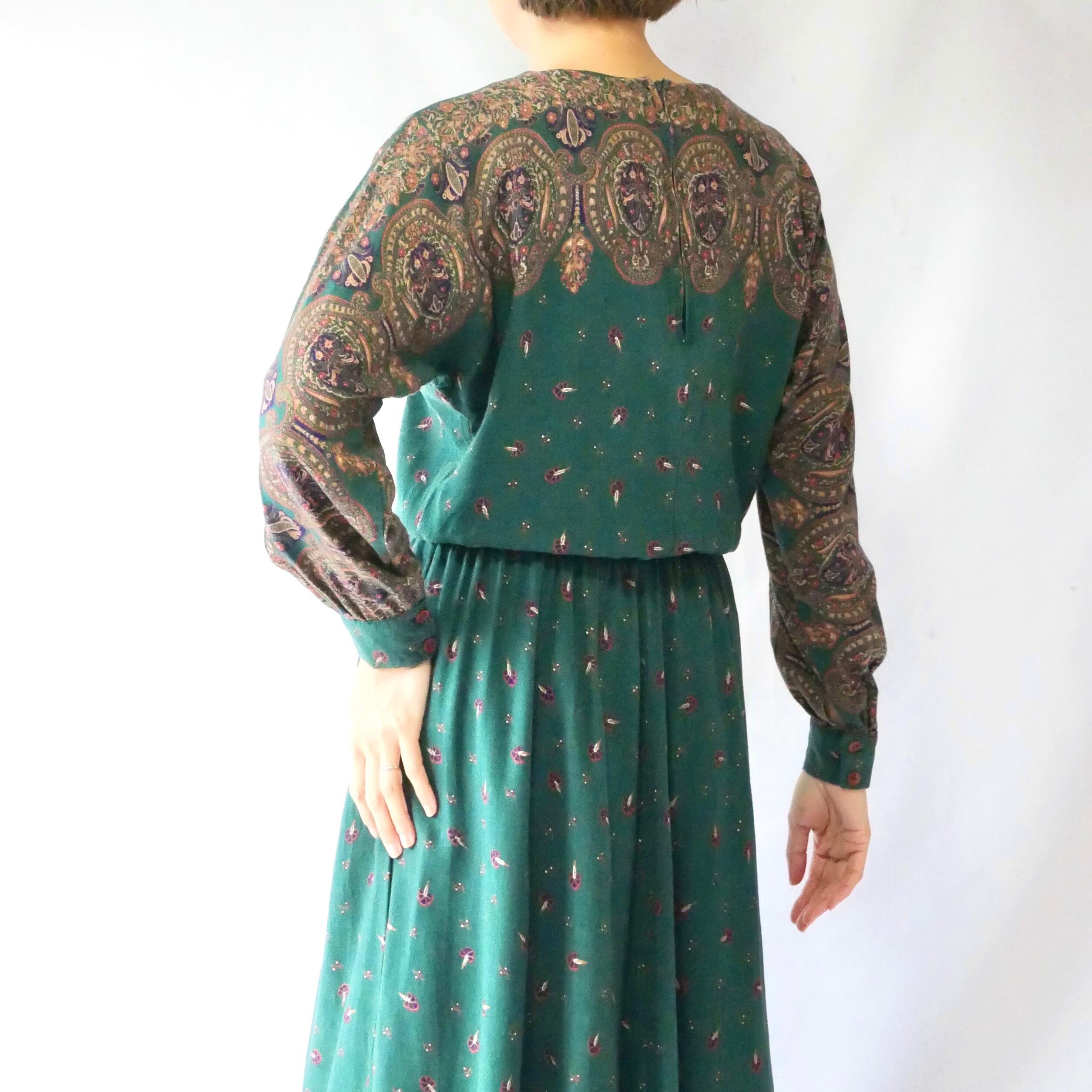 落ち着いたダークグリーンにペイズリーや孔雀の羽根のようなデザインのUSA製ワンピースです。