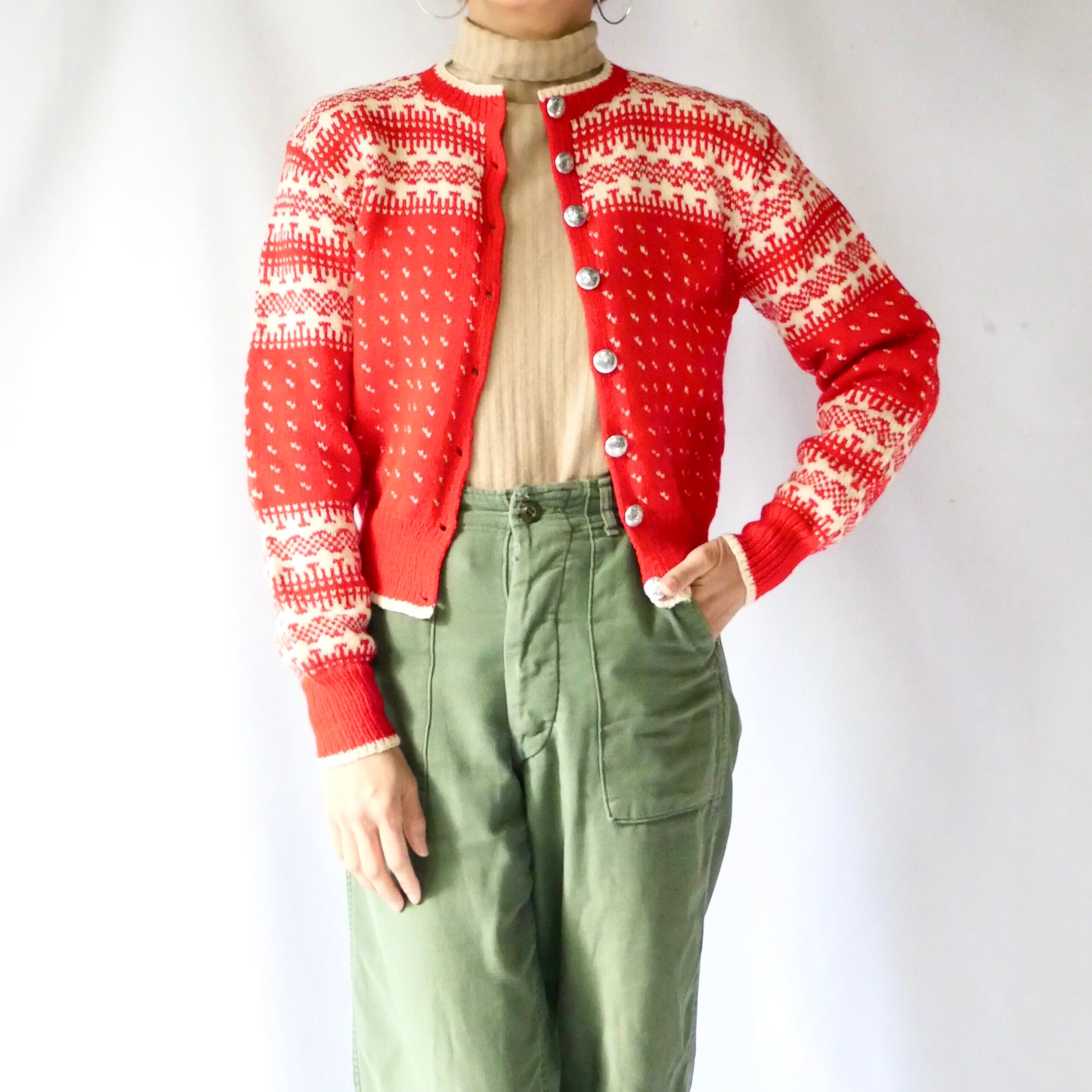 真っ赤な色合いにコンチョボタンが可愛いヴィンテージノルディックウールニットカーディガンです。
