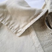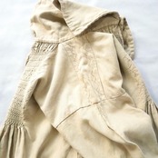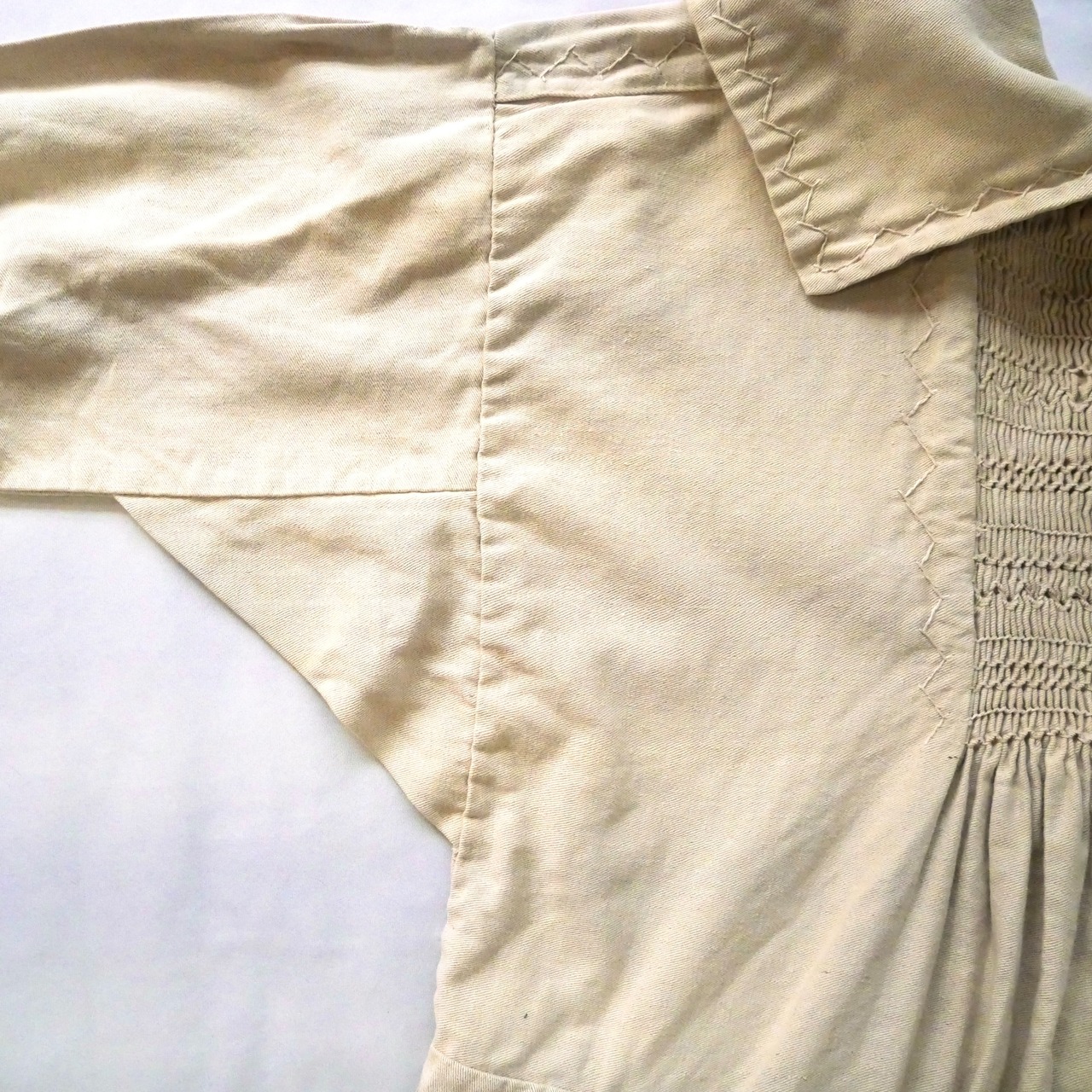 かなり細かいスモッキング刺繍が胸元、背中、肩、袖口に施されており、とても凝った作りです。